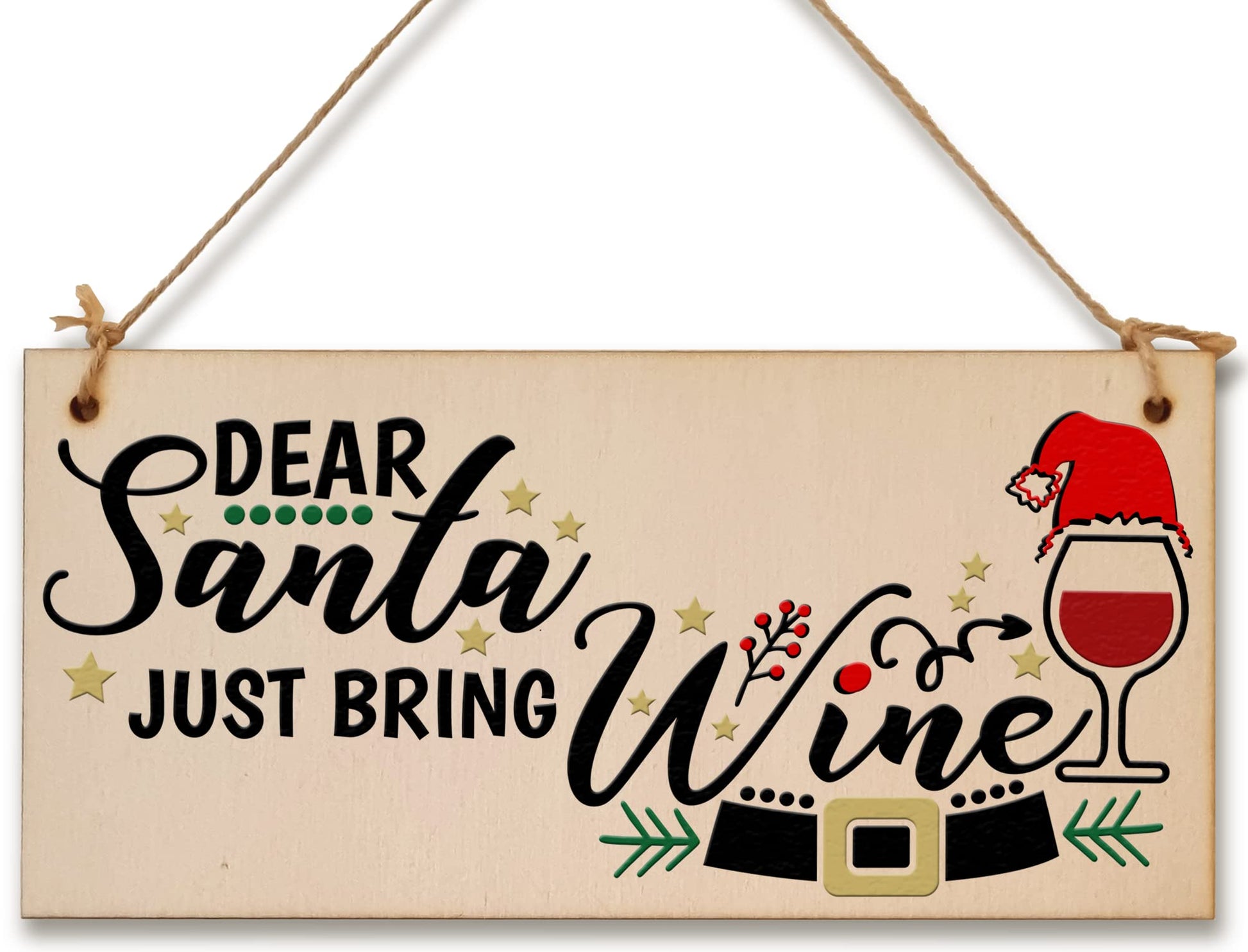 Dear Santa, Just bring wine Funny Novelty Boozy Christmas Sign Handmade Wooden Hanging Wall Plaque Gift for Kitchen