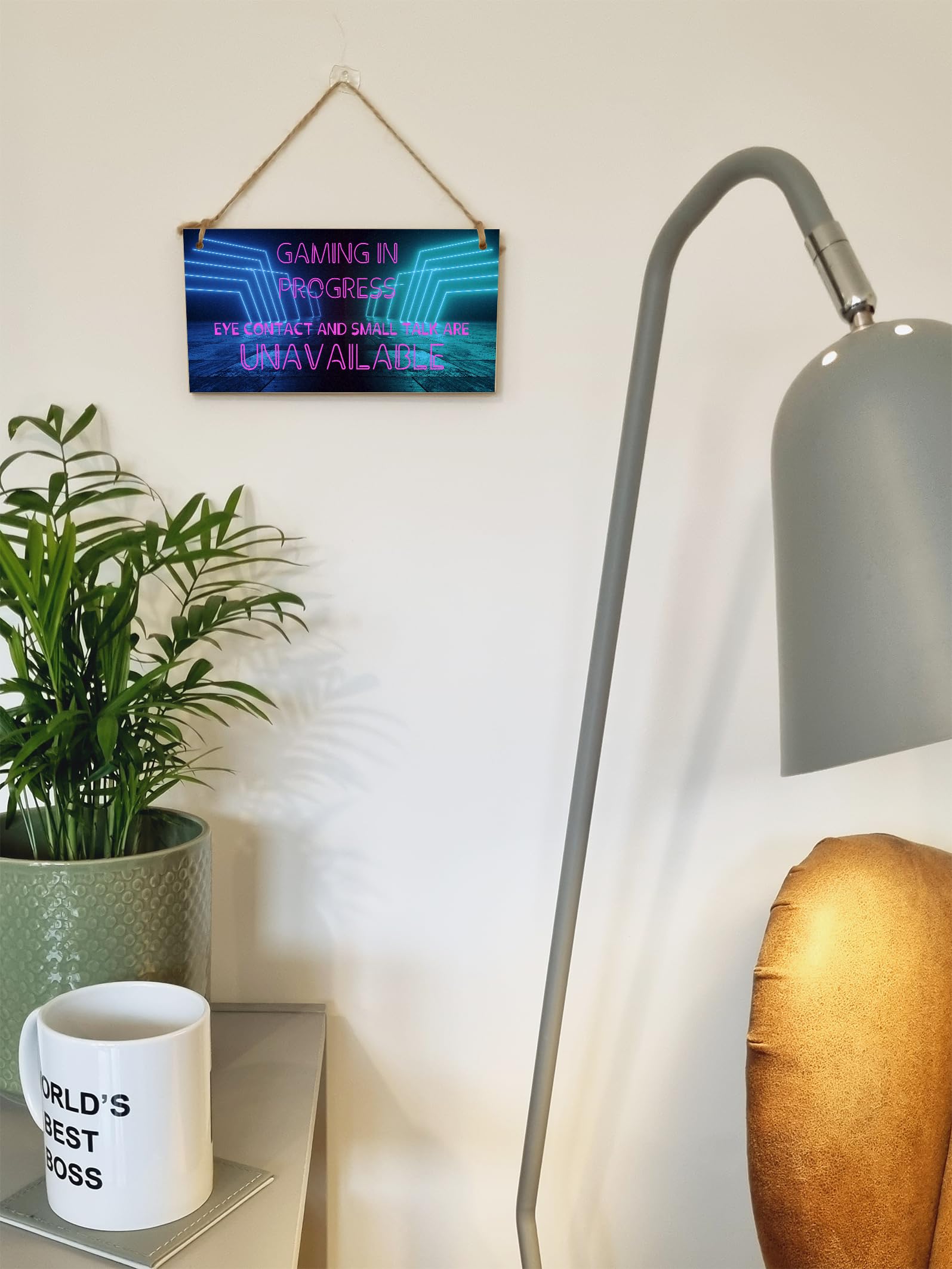 A decorative rectangular wooden hanging wall plaque, which is a stylish and unique way to decorate your home, or to give as a gift to someone special. Wording on the plaque: Gaming in Progress Eye contact and Small Talk Unavailable. The perfect door hanger or bedroom sign for gaming loving teenage boys, or hung in a man cave. This is a novelty and fun plaque with a whimsical take on the world of computer games. The plaque is made from high quality 6mm MDF. The image is UV-printed in full colour, directly onto the wooden plaque, to ensure a high quality, bold and durable finish. It is packaged in a transparent sleeve, making it ideal to give as a gift, and comes with a small length of shabby, rustic hessian twine to hang up. This creative piece of wall art will add that little something extra to your space. From the kitchen to the living room, in the bathroom or the study, showcase your personality and hobbies in a fun and whimsical display. If not as a treat for you, then these are perfect to give as a gift to friends, family, neighbours, and colleagues. ***Please note, because these are made from untreated wood, the sign is designed for indoor use and should only be displayed outside for short periods during dry weather. Prolonged exposure to outdoor elements such as rain, water, frost, heat and UVs will damage and fade your sign.***