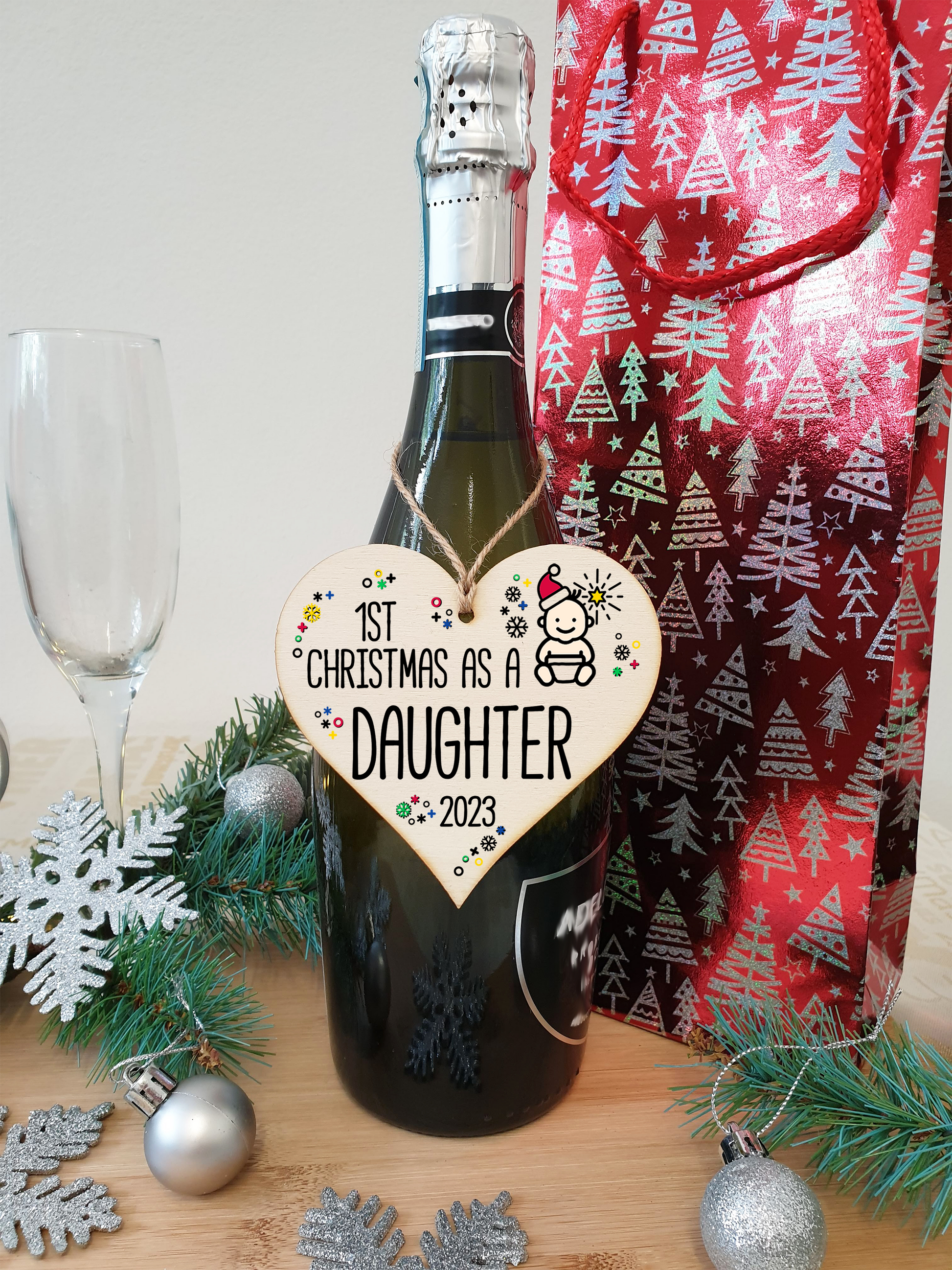� Small gift that is a perfect alternative to a greetings card. Makes an ideal Secret Santa present. � Hang on the tree, slip into a card, use as a gift tag on a present, or round the neck of a bottle. � Packaged in a transparent sleeve. Size: Approx. 9 x 9 cm. Includes a length of hessian twine for hanging � Made from high quality sustainable 3mm Plywood (PEFC Certified)Wording on plaque decoration: 2022 1st Christmas as a Daughter These beautiful handcrafted heart shaped wooden Christmas plaques make a great little gift for someone special. The exclusive festive design will add style to any gift or tree, and the shabby chic effect is on trend. This could make an ideal Sercret Santa gift for colleagues at work. Ideal for use as tags on presents and gift bags. Hang around the neck of a bottle of fizz at the Christmas dinner table. Perfect as a bauble or sign to hang on your Christmas tree for a unique and personal way to celebrate Christmas. Use as place settings, wrapped around the stem of a wine glass. Or wish someone a very Merry Christmas, just because! **Please note colours may vary on product due to materials used and hand-made nature of the product.