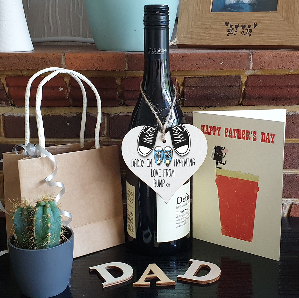 � {Stylish & Unique} The design is unique and exclusive to the Plum Penguin. It was hand illustrated and is printed in full colour on the wooden heart, to ensure a high quality durable finish. � {Perfect Gift} This is a great small gift for dad, grandad, stepdads, uncles and papas, that is a perfect alternative to a traditional Father's Day greetings card. � {Attractive} Packaged in a transparent sleeve, these look smart and sleek to give as a gift. � {Presentation} Size: 10 x 10 cm. Includes a length of hessian twine for hangingA beautifully designed, handmade heart shaped plaque, made from 3mm poplar wood. Size: 10 x 10 cm. Wording on hanging plaque: Daddy in training. Love From Bump xx (Blue Shoes). These handcrafted, heart shaped wooden plaques make the perfect gift for someone very special. Stand out from the crowd and give your daddy or grandpa this cute and unique present. Made from 3mm poplar wood, which is sustainably sourced, these are an ideal alternative to a traditional Father's Day greetings card. The wording is just perfect to show your dad just how much you love him. Maybe you aren't able to see grandad this year so this gift is perfect to send to distant relatives. Ideal for use as tags on presents and gift bags, or you could hang it around the neck of a bottle. These also fit nicely in an envelope for posting directly to the intended recipient. The heart is packaged in a transparent sleeve, and comes with a length of shabby chic twine. The print is applied directly onto the heart and is extremely durable and vibrant.