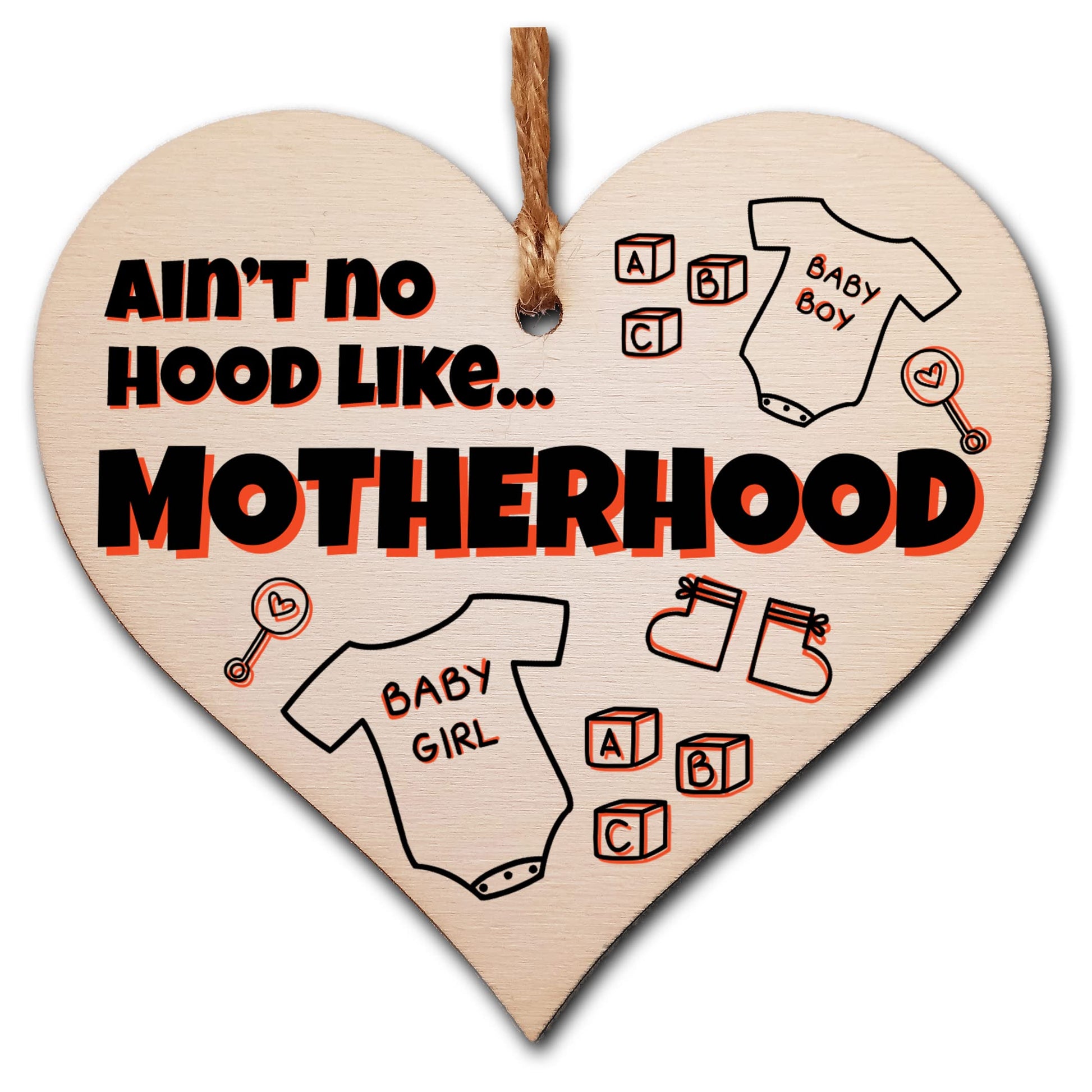 Beautiful handmade wooden heart shaped plaque. Shabby chic style hanging sign, with a unique printed design. Ideal gift for someone special. Made from high quality sustainable 3mm Plywood (Programme for the Endorsement of Forest Certification). Can be used as a hanging decoration, or even as a gift tag. Tag Reads Ain't no hood like motherhood