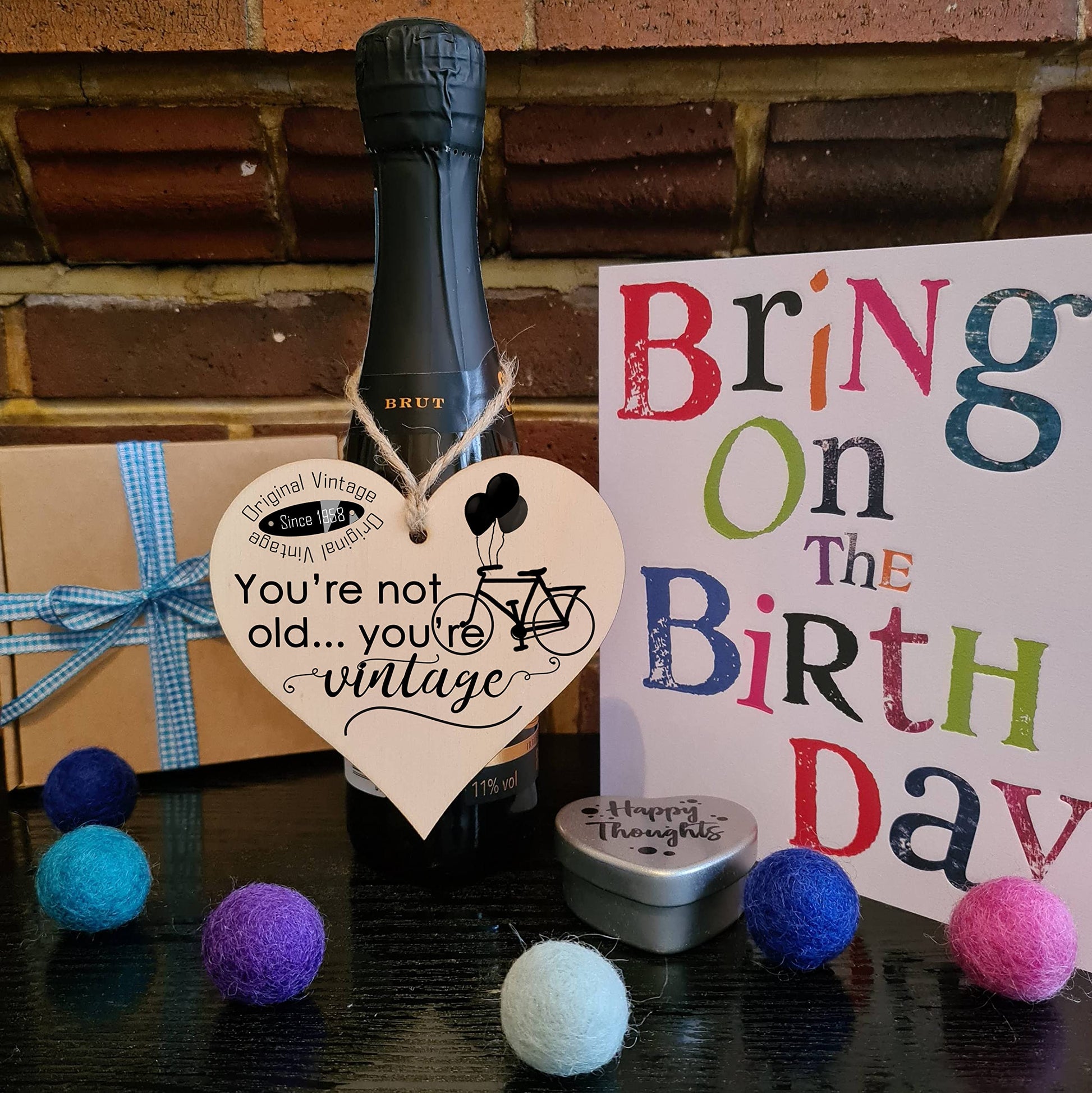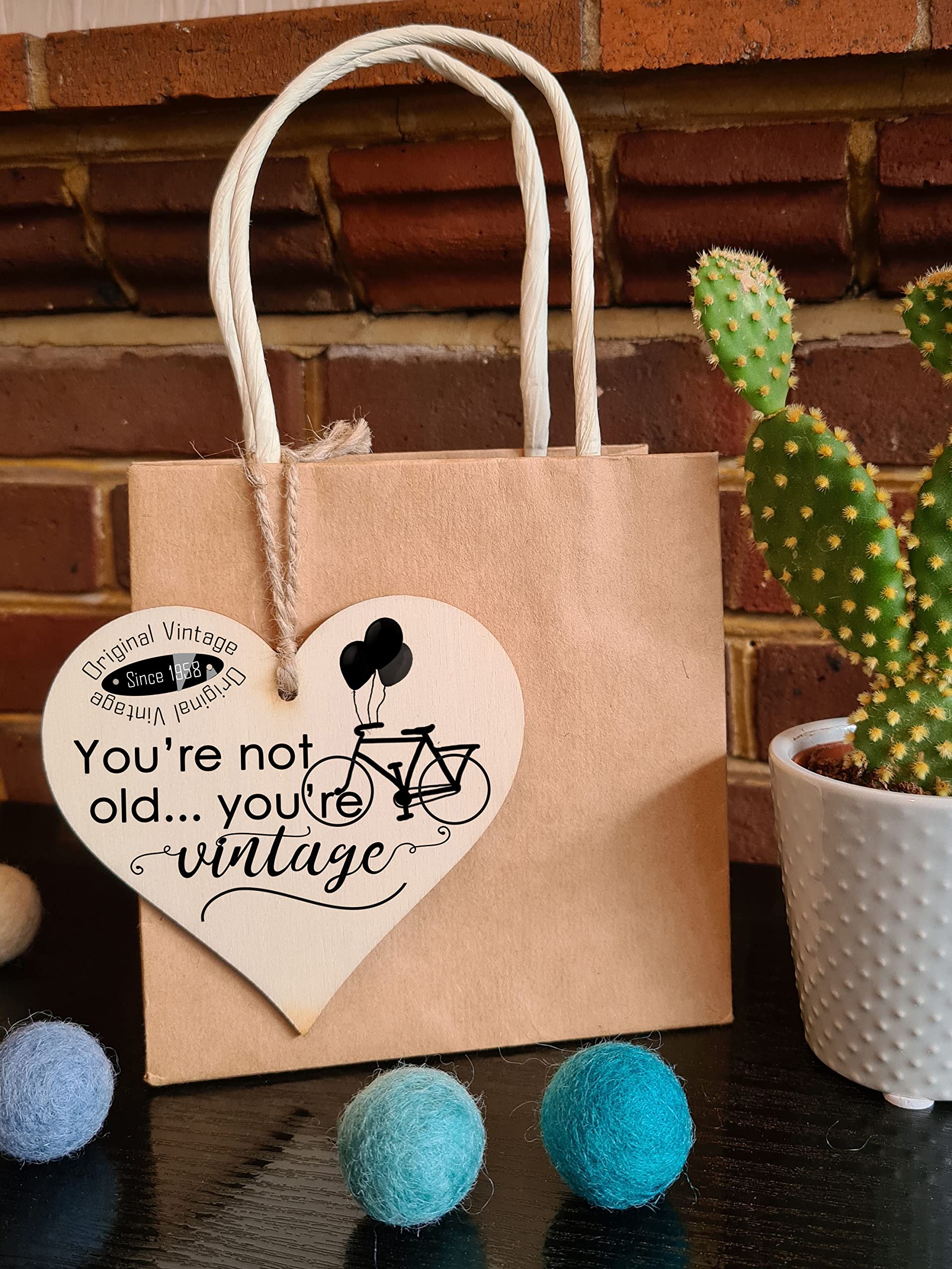 Beautiful handmade wooden heart shaped plaque. Shabby chic style hanging sign, with a unique printed design. Ideal gift for someone special. Made from high quality sustainable 3mm Plywood (Programme for the Endorsement of Forest Certification). Can be used as a hanging decoration, or even as a gift tag. Tag Reads You're not old… you're vintage. Since (change year)
