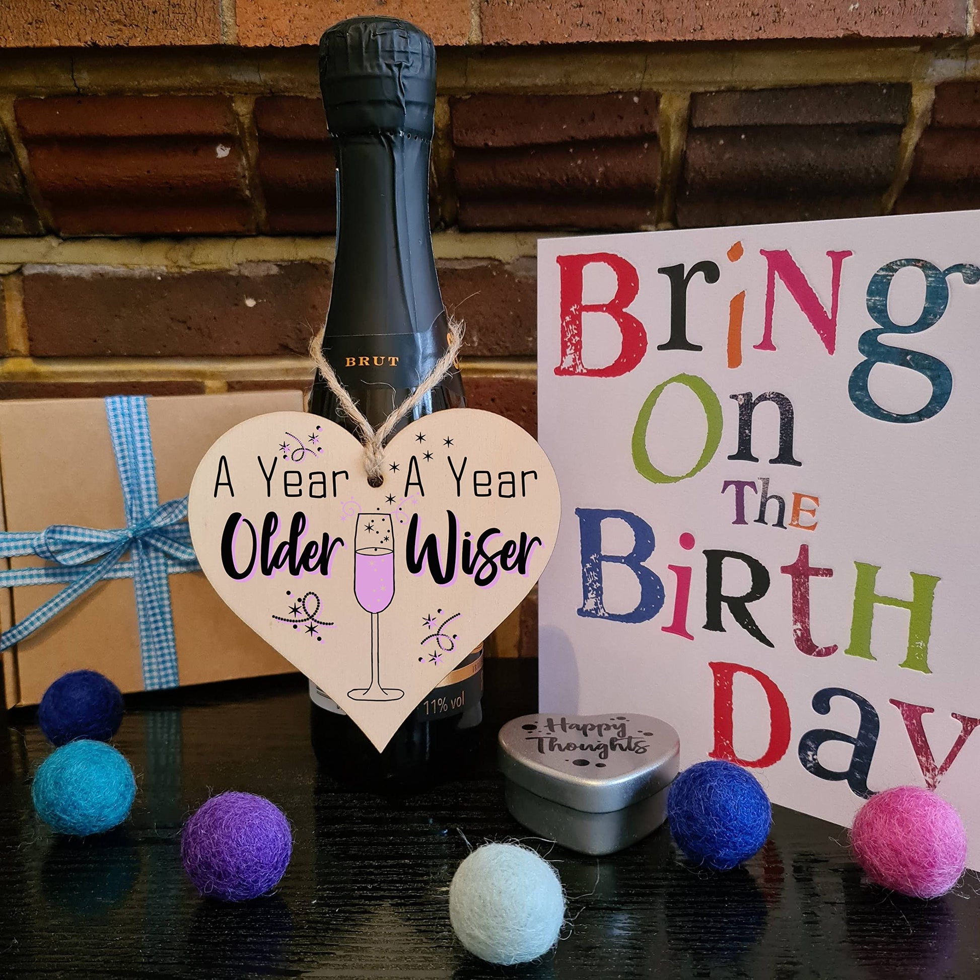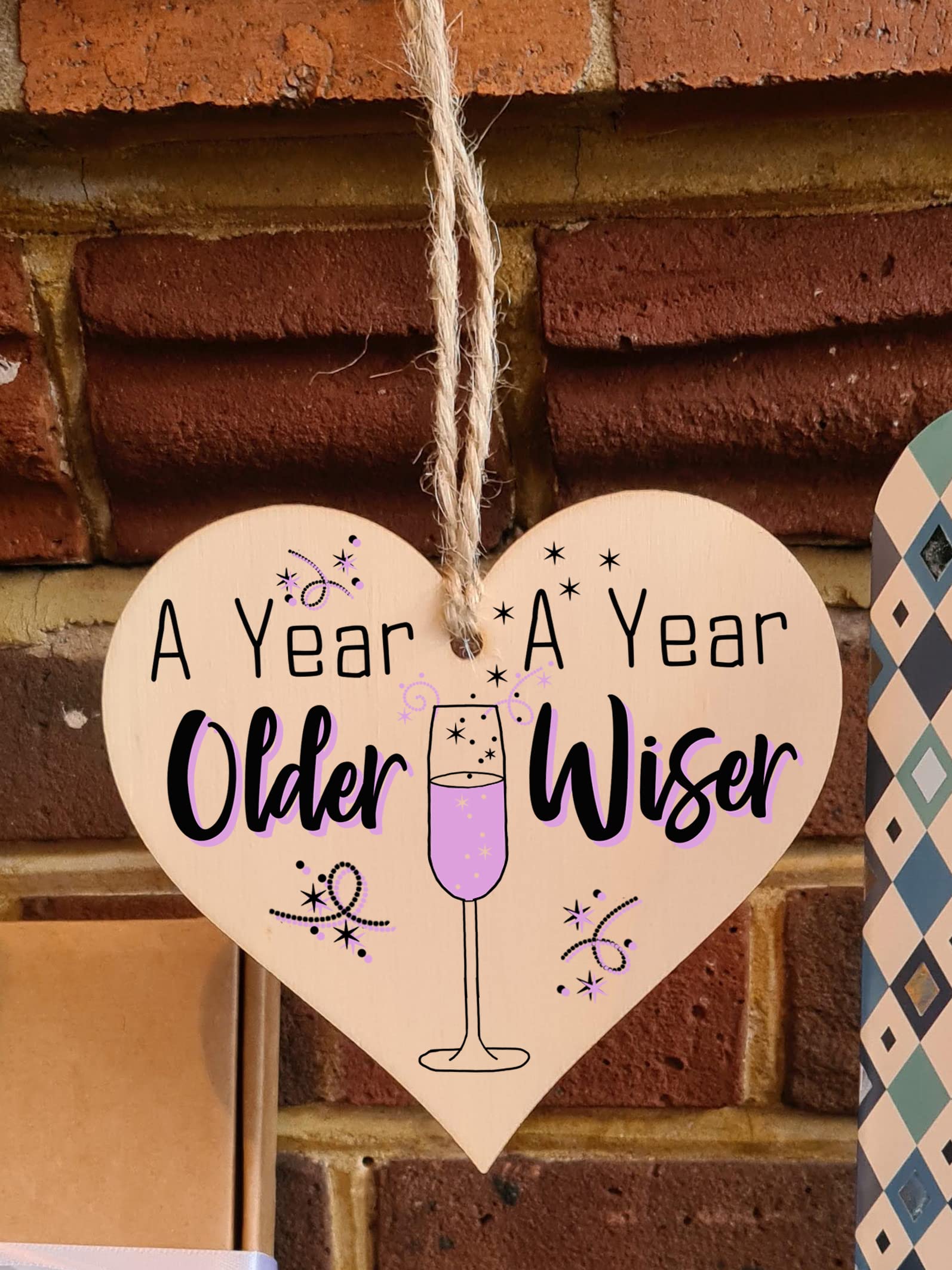 Beautiful handmade wooden heart shaped plaque. Shabby chic style hanging sign, with a unique printed design. Ideal gift for someone special. Made from high quality sustainable 3mm Plywood (Programme for the Endorsement of Forest Certification). Can be used as a hanging decoration, or even as a gift tag. Tag Reads A Year Older - A Year Wiser