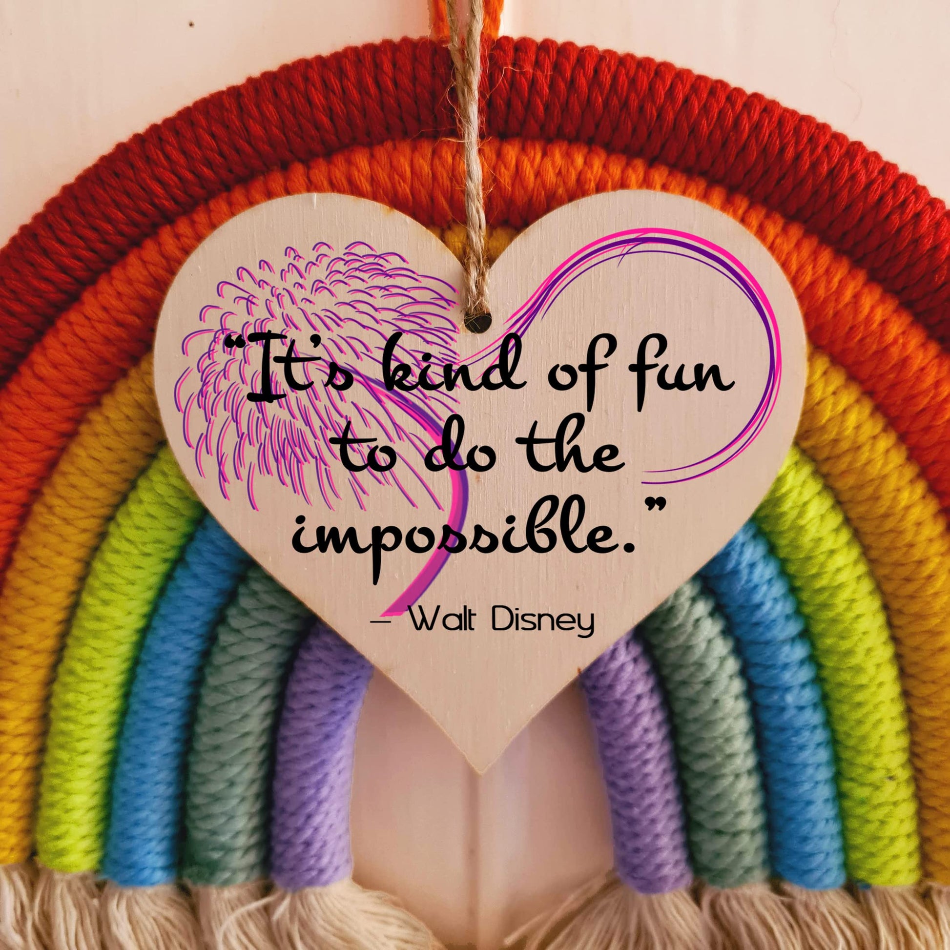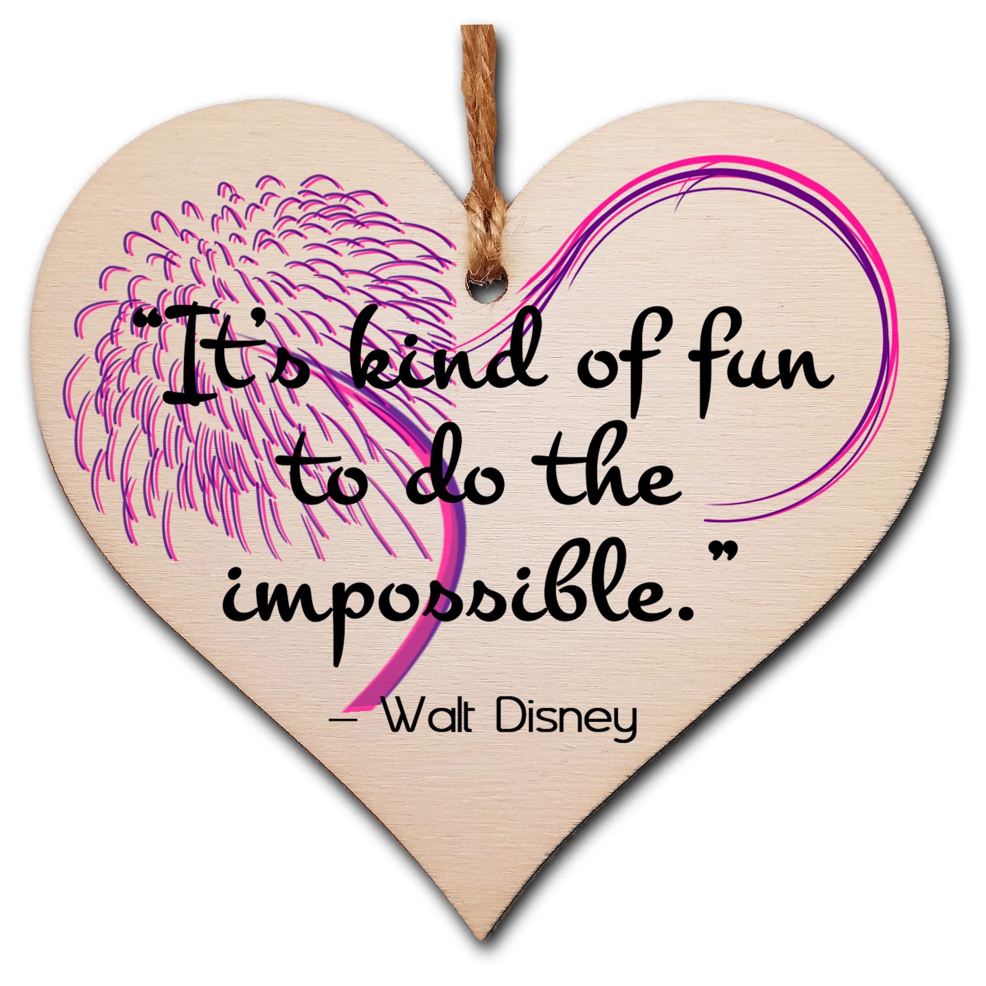 Beautiful handmade wooden heart shaped plaque. Shabby chic style hanging sign, with a unique printed design. Ideal gift for someone special. Made from high quality sustainable 3mm Plywood (Programme for the Endorsement of Forest Certification). Can be used as a hanging decoration, or even as a gift tag. Tag Reads It’s kind of fun to do the impossible.” – Walt Disney