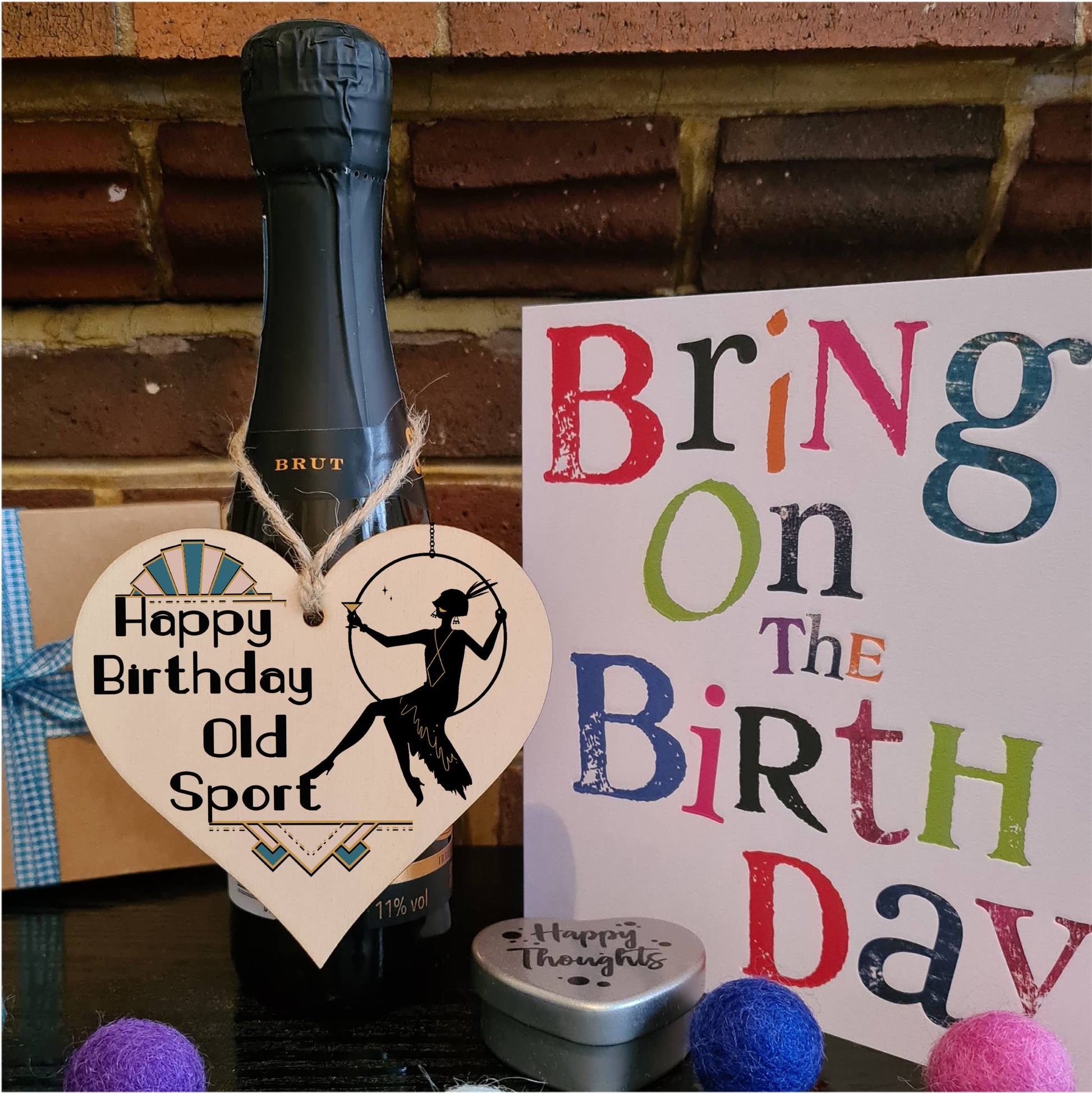 Happy Birthday Old Sport Art Deco Modern Style Funny Hanging Heart Wooden Decoration Gift Card Alternative