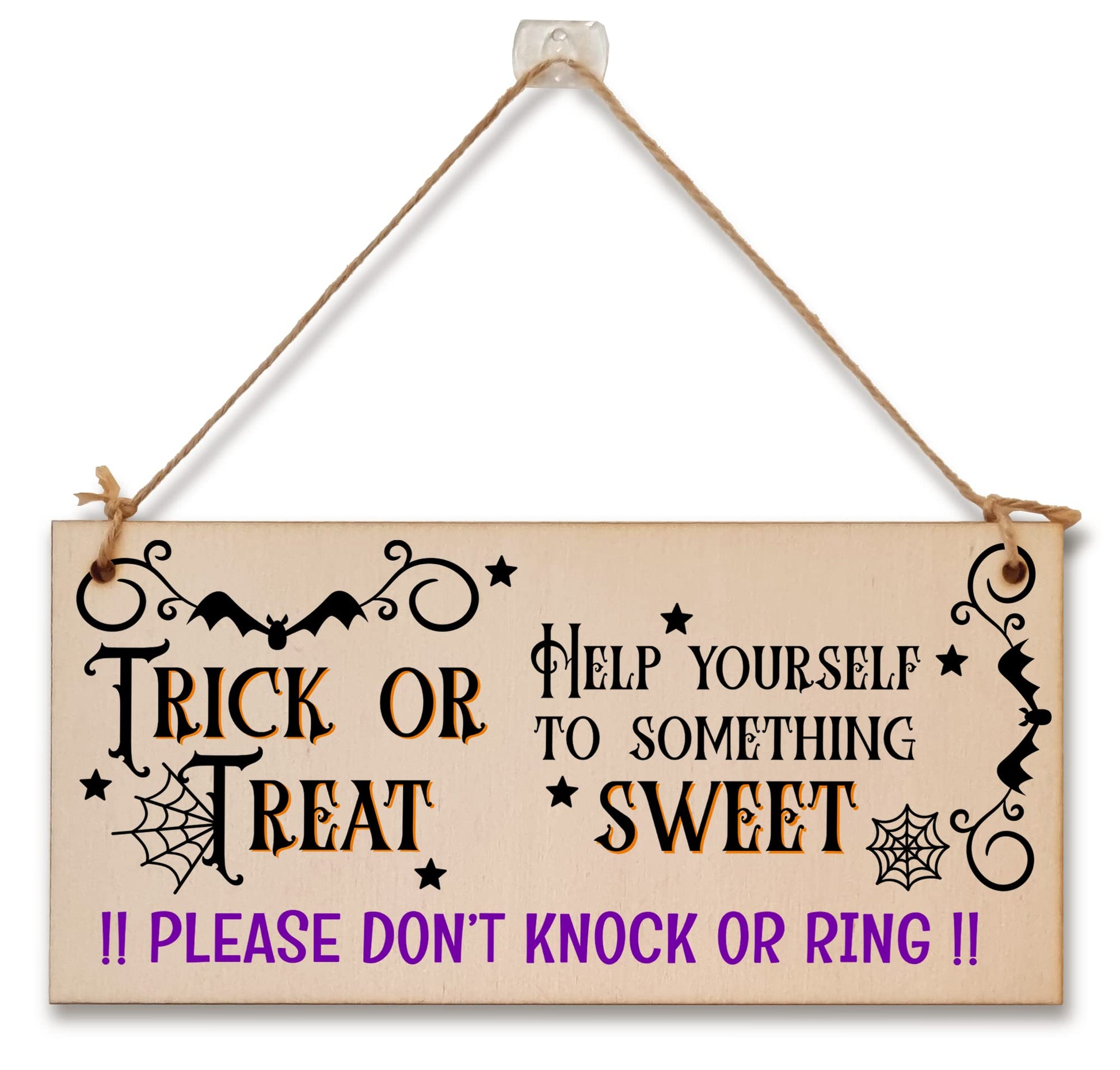 A beautifully designed, heart shaped plaque, handmade in the UK from sustainably sourced 3mm poplar wood. Size: 10 x 10 cm. Wording on hanging plaque: Trick or Treat Help Yourself to something sweet !!Please do not knock or ring!! . Hang this sign in your window, or by your front door on Halloween night to tell all the trick or treaters that you don't want to be disturbed on the spookiest night of the year. Show that sweets can be taken but do n't knock or ring. A perfect, fun decorative sign to show that you just aren't into celebrating Halloween and to deter any little monsters from knocking on your front door. The plaque is made from high quality, sustainably sourced 6mm Plywood (PEFC Certified). The image is UV-printed in full colour, directly onto the wooden plaque, to ensure a high quality, bold and durable finish. It is packaged in a transparent sleeve, making it ideal to give as a gift, and comes with a small length of shabby, rustic hessian twine to hang up. This creative piece of wall art will add that little something extra to your space. From the kitchen to the living room, in the bathroom or the study, showcase your personality and hobbies in a fun and whimsical display. If not as a treat for you, then these are perfect to give as a gift to friends, family, neighbours, and colleagues. ***Please note, because these are made from untreated wood, the sign is designed for indoor use and should only be displayed outside for short periods during dry weather. Prolonged exposure to outdoor elements such as rain, water, frost, heat and UVs will damage and fade your sign.***