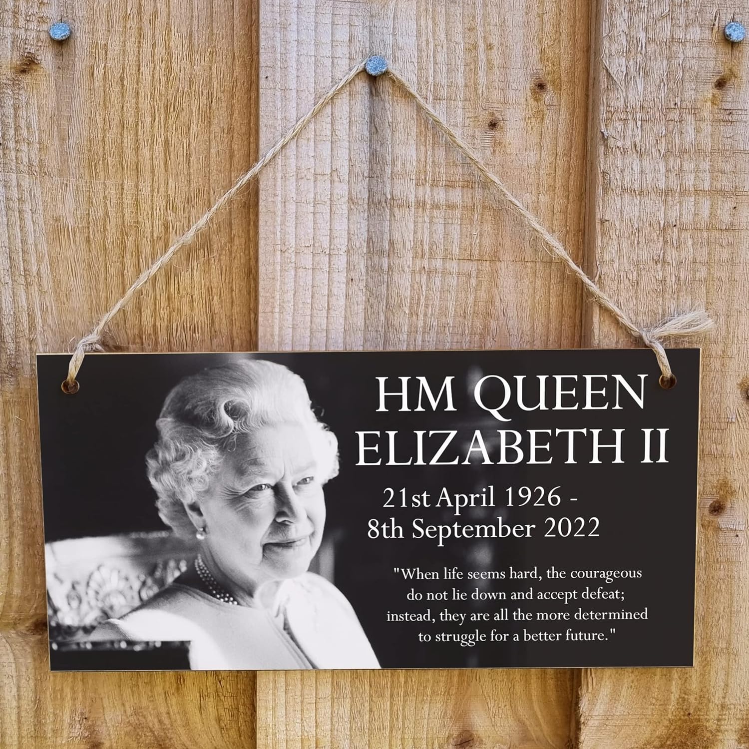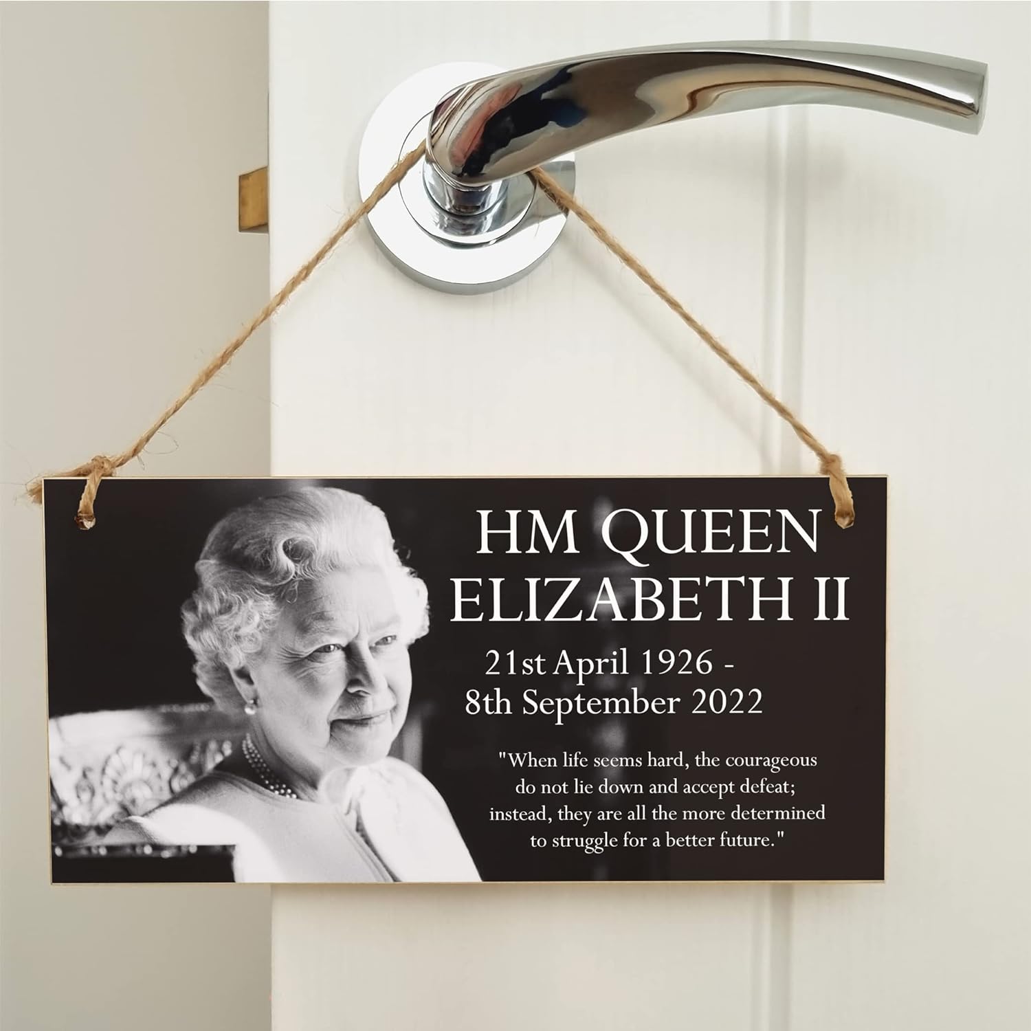 � {Commemorate HM Queen Elizabeth II} A unique and poignant keepsake to our wonderful queen. Celebrate the life of Her Majesty Queen Elizabeth with a wonderful piece of memorabilia. Can be hung throughout the home, in memory of our beloved monarch. � {Beautiful Decoration} A beautiful photo of Queen Elizabeth in commemoration of her passing on 8th September 2022. A long life, filled with good deeds and lasting impact on all our lives. � {Materials & Size} Actual Size: 200mm (W) x 100mm (L). We use sustainably sourced 6mm Plywood (PEFC Certified) from a family run forestry. Every plaque is packaged in a transparent sleeve, ready to gift, and with a length of rustic hessian jute string for hanging. � {Handmade in the UK} The plaque is handcrafted in Birmingham, UK, by a small team dedicated to creating high quality, affordable decorations. Every order is cut, printed and packaged with care and attention to ensure the product reaches you in perfect condition.A decorative rectangular wooden hanging wall plaque, specially designed to commemorate the passing of Her Majesty Queen Elizabeth. Wording on the plaque: HM Queen Elizabeth II 21st April 1926 - 8th September 2022 "When life seems hard, the courageous do not lie down and accept defeat; instead, they are all the more determined to struggle for a better future." Celebrate the life of our wonderful Queen with this beautiful keepsake. An ideal piece of memorabilia after the passing of Her Majesty Queen Elizabeth II. The plaque is made from high quality, sustainably sourced 6mm Plywood (PEFC Certified). The image is UV-printed in full colour, directly onto the wooden plaque, to ensure a high quality, bold and durable finish. It is packaged in a transparent sleeve, making it ideal to give as a gift, and comes with a small length of shabby, rustic hessian twine to hang up. This creative piece of wall art will add that little something extra to your space. From the kitchen to the living room, in the bathroom or the study, showcase your personality and hobbies in a fun and whimsical display. If not as a treat for you, then these are perfect to give as a gift to HHfriends, family, neighbours, and colleagues. ***Please note, because these are made from untreated wood, the sign is designed for indoor use and should only be displayed outside for short periods during dry weather. Prolonged exposure to outdoor elements such as rain, water, frost, heat and UVs will damage and fade your sign.***