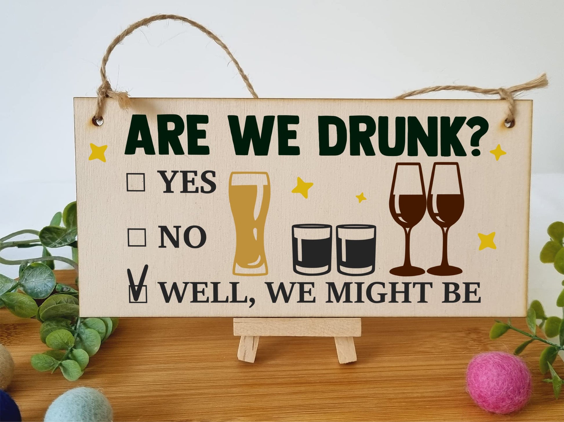 The Plum Penguin Are We Drunk? Might Be Funny Novelty Handmade Wooden Hanging Wall Plaque Gift Home Bar Man Cave Sign Decoration