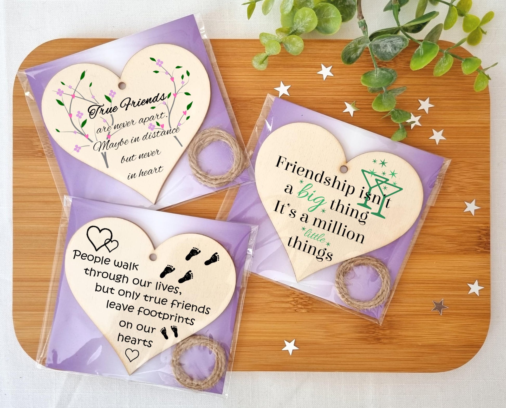Intertwining the enchanting threads of friendship and sustainability, our set of heart-shaped plaques embody the depth and sincerity of cherished bonds and eco-conscious living. Expertly crafted in the UK from 3mm FSC certified sustainable ply, each plaque narrates a different chapter of friendship, culminating in a set that is as rich and varied as the connections it honors. With every heart gifted, you’re not only sharing a physical representation of love and friendship but also expressing a thoughtful choice towards preserving our planet. Allow these pieces to linger warmly in homes and hearts, becoming daily reminders of beautiful bonds and our shared journey towards a sustainable future. - Heart 1 reads - True friends are never apart. Maybe in distance but never in heart. - Heart 2 reads - People walk through our lives, but only true friends leave footprints on our hearts. - Heart 3 reads - Friendship isn't a big thing, it’s a million little things.