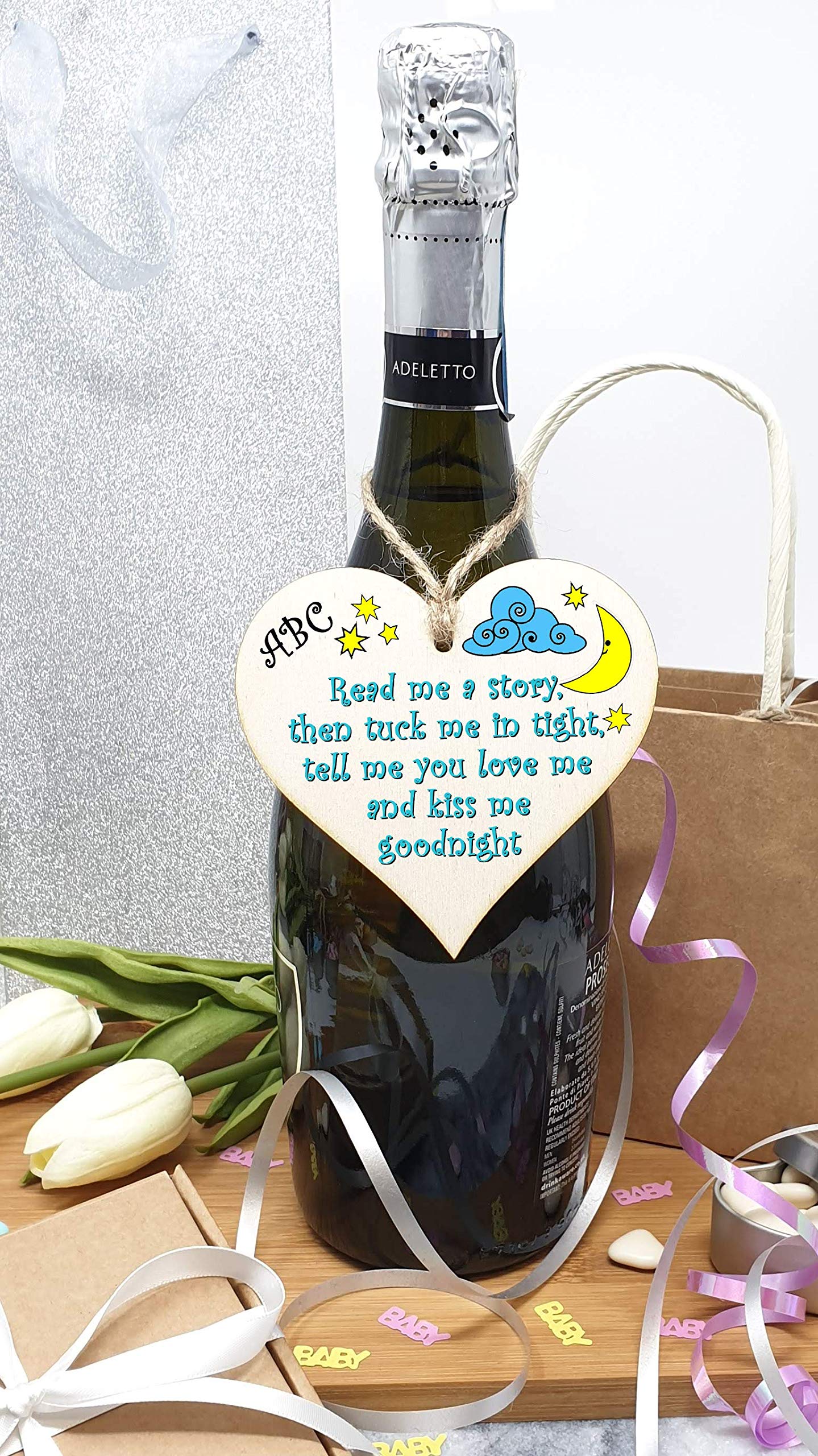 Wording on plaque decoration: Read me a story then tuck me in tight, tell me you love me and kiss me goodnight. These beautiful, handcrafted, heart shaped wooden plaques make a great little gift to commemorate the arrival of a new baby. They make an ideal present for new parents, or grandparents. The shabby chic wooden effect is perfectly on trend but also timeless in style. The storybook style design is perfect to decorate a nursery or little child's bedroom. The plaque is packaged in a transparent sleeve making it ideal to present in a card, or even to use as an alternative to a traditional greetings card. These also look perfect used as a tag on a gift bag. Or why not wrap around the neck of a celebratory bottle of champagne to toast the new arrival in the family.