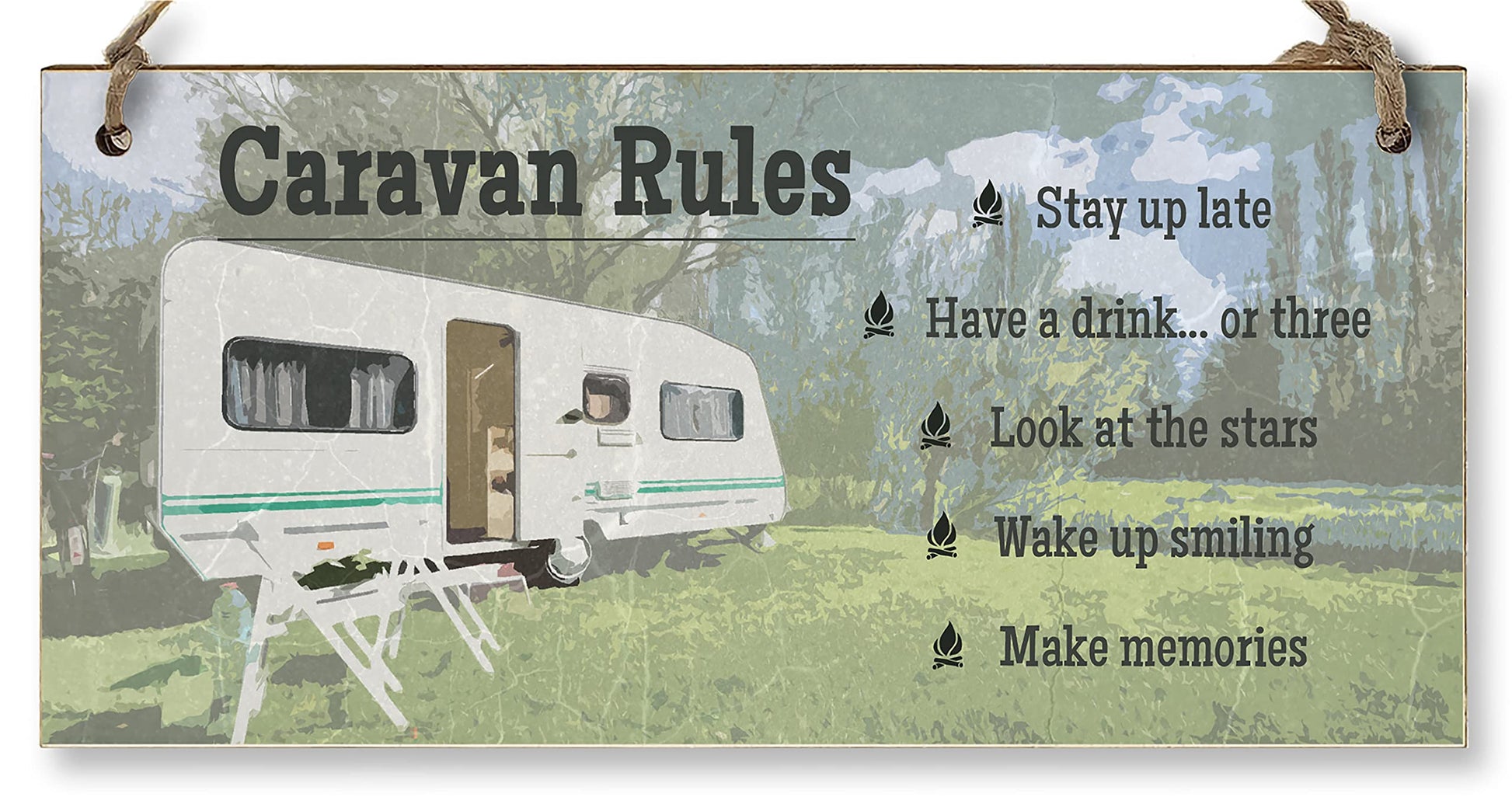 The Plum Penguin Handmade Wooden Hanging Wall Plaque Caravan Rules Stay Up Late Have a Drink Make Memories Fun Camping Adventure Sign