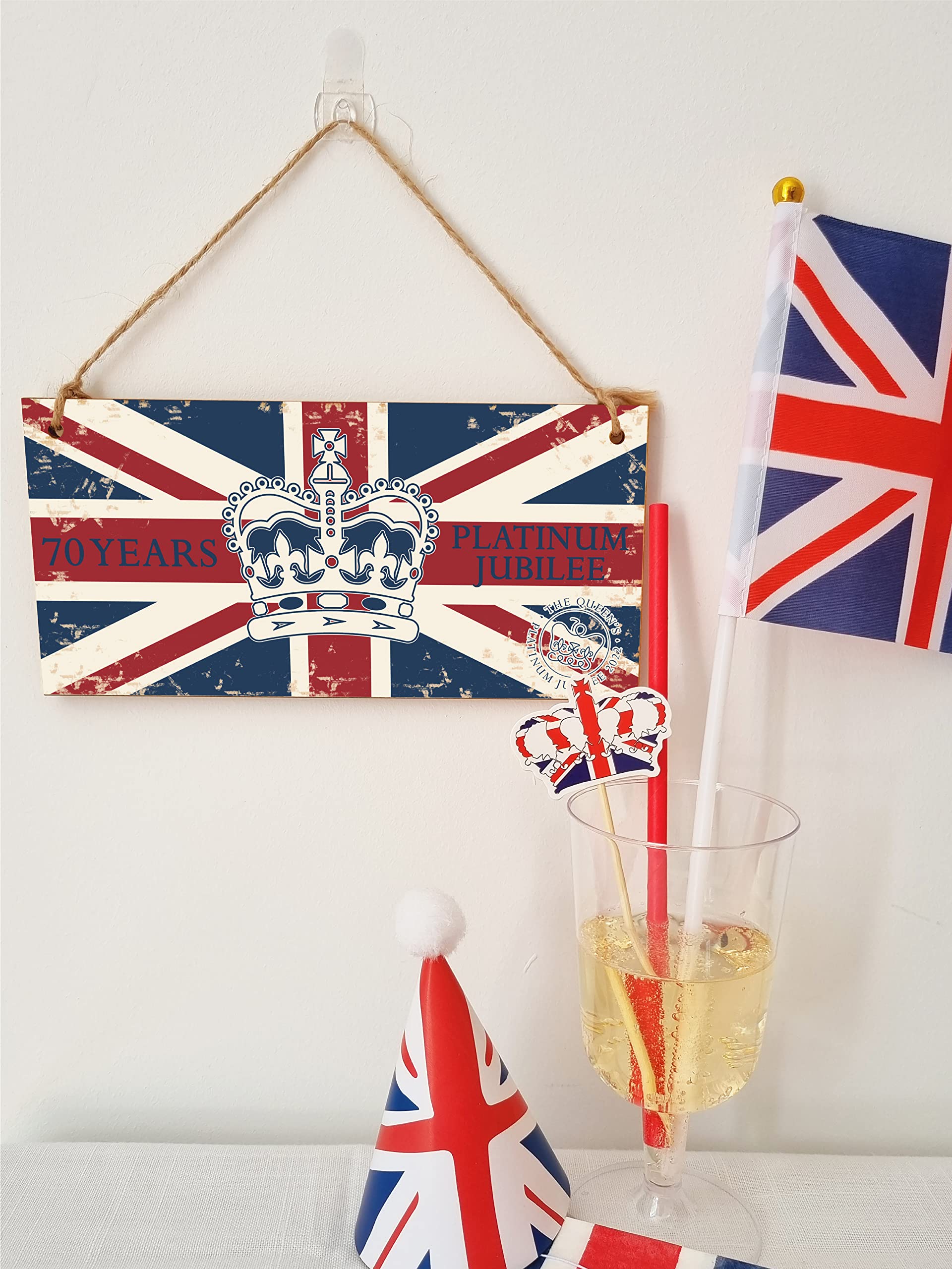 A decorative rectangular wooden hanging wall plaque, which is a stylish and unique way to celebrate the Queen's Platinum Jubilee June 2022. Wording on the plaque: 70 YEARS PLATINUM JUBILEE. With a unique, patriotic and celebratory design, this hanging sign can be used a decoration or given as a gift. Featuring Union Jack flags, a celebration of all things British, crowns and a nod to Her Majesty's 70 year reign. A great piece of memorabilia to remind us of this historic event in 2022. This plaque is the perfect addition to any celebration of the Queen's 70th Platinum Jubilee. The plaque is made from high quality, sustainably sourced 5mm Plywood (PEFC Certified). The image is UV-printed in full colour, directly onto the wooden plaque, to ensure a high quality, bold and durable finish. It is packaged in a transparent sleeve, making it ideal to give as a gift, and comes with a small length of shabby, rustic hessian twine to hang up. This creative piece of wall art will add that something extra to any jubilee party or celebration. ***Please note, because these are made from untreated wood, the sign is designed for indoor use and should only be displayed outside for short periods during dry weather. Prolonged exposure to outdoor elements such as rain, water, frost, heat and UVs will damage and fade your sign.***