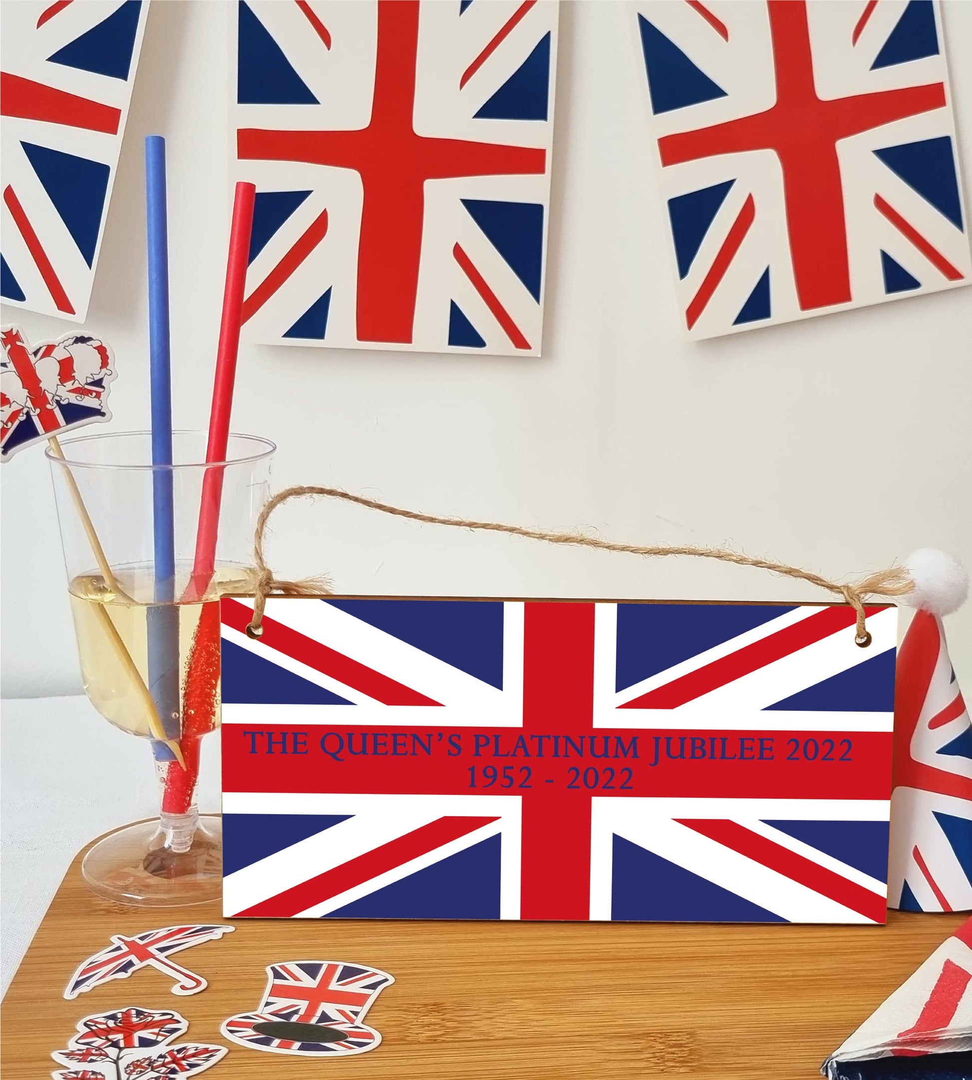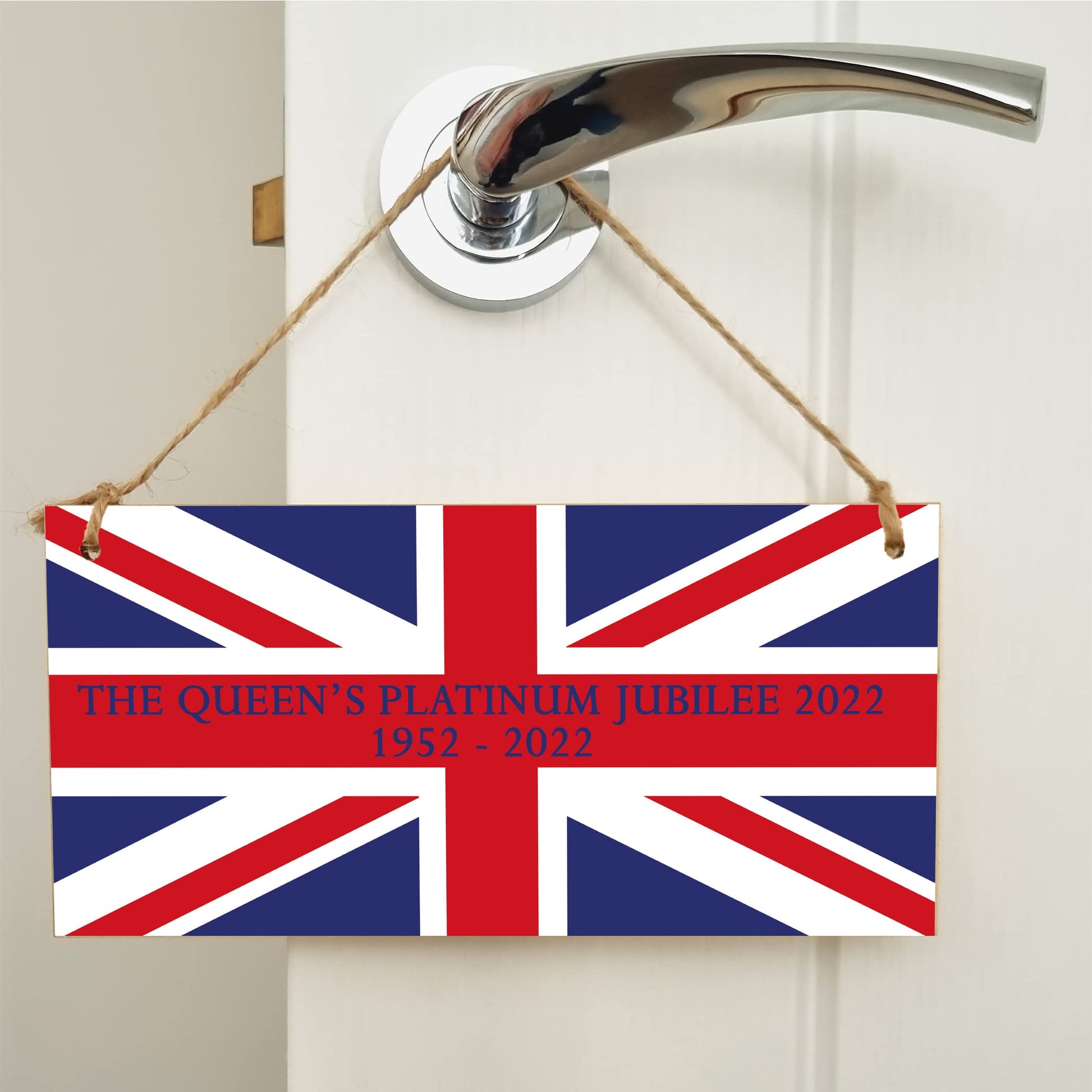 The Plum Penguin Handmade Wooden Hanging Wall Plaque Celebrate 70 Years Queen's Platinum Jubilee 2022 Union Jack Decorative Memorabilia Street Party