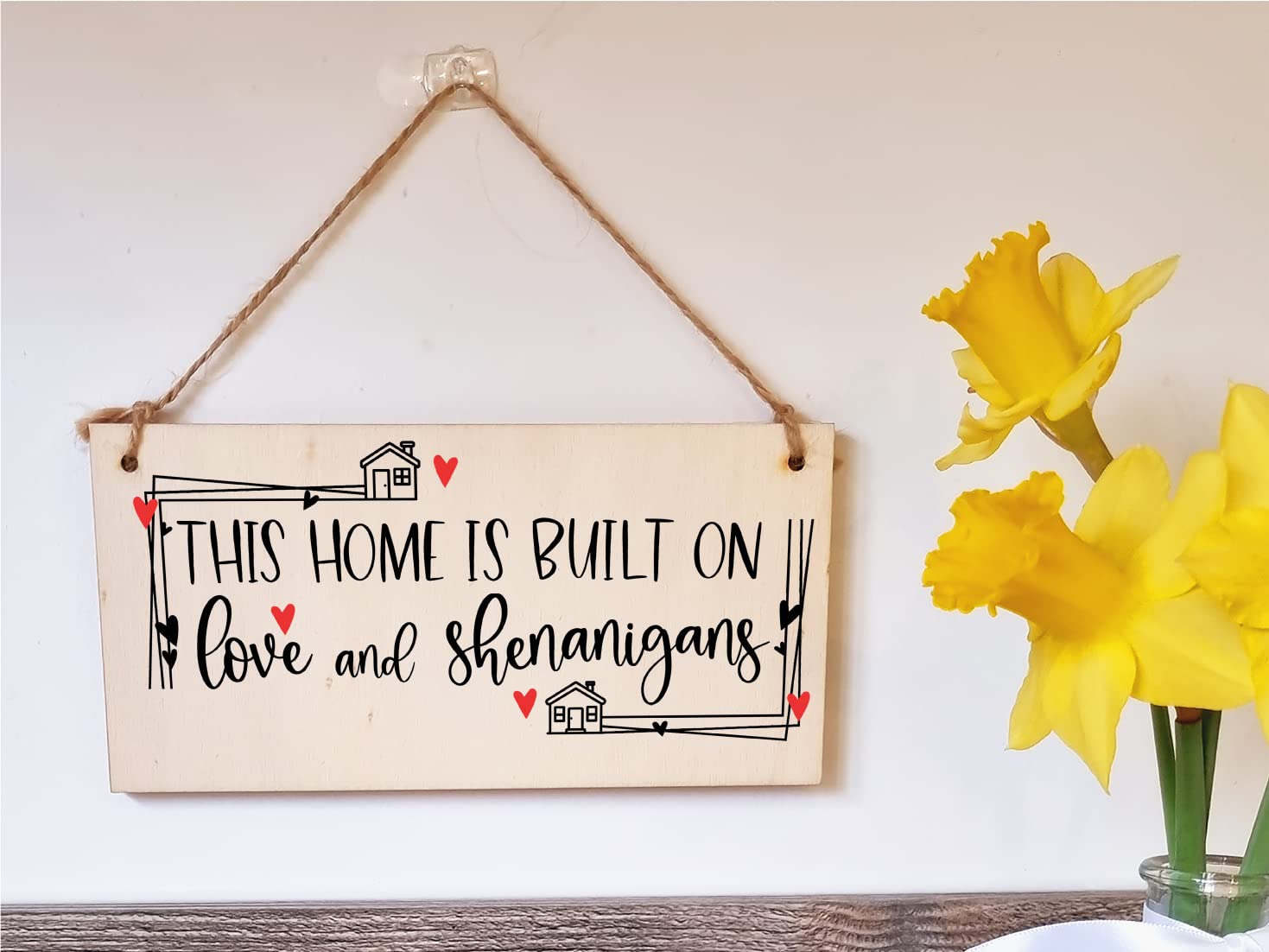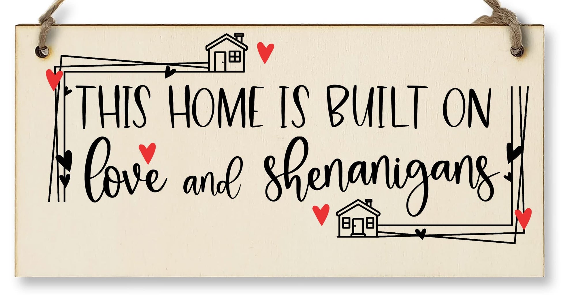 A decorative rectangular wooden hanging wall plaque, which is a stylish and unique way to decorate your home, or to give as a gift to someone special. Wording on the plaque: This home is built on love and shenanigans. This plaque is a beautiful reminder of the love in your home, and would be perfect in any room of the house to celebrate your family. The plaque is made from high quality, sustainably sourced 5mm Plywood (PEFC Certified). The image is UV-printed in full colour, directly onto the wooden plaque, to ensure a high quality, bold and durable finish. It is packaged in a transparent sleeve, making it ideal to give as a gift, and comes with a small length of shabby, rustic hessian twine to hang up. This creative piece of wall art will add that little something extra to your space. From the kitchen to the living room, in the bathroom or the study, showcase your personality and hobbies in a fun and whimsical display. If not as a treat for you, then these are perfect to give as a gift to friends, family, neighbours, and colleagues. ***Please note, because these are made from untreated wood, the sign is designed for indoor use and should only be displayed outside for short periods during dry weather. Prolonged exposure to outdoor elements such as rain, water, frost, heat and UVs will damage and fade your sign.***