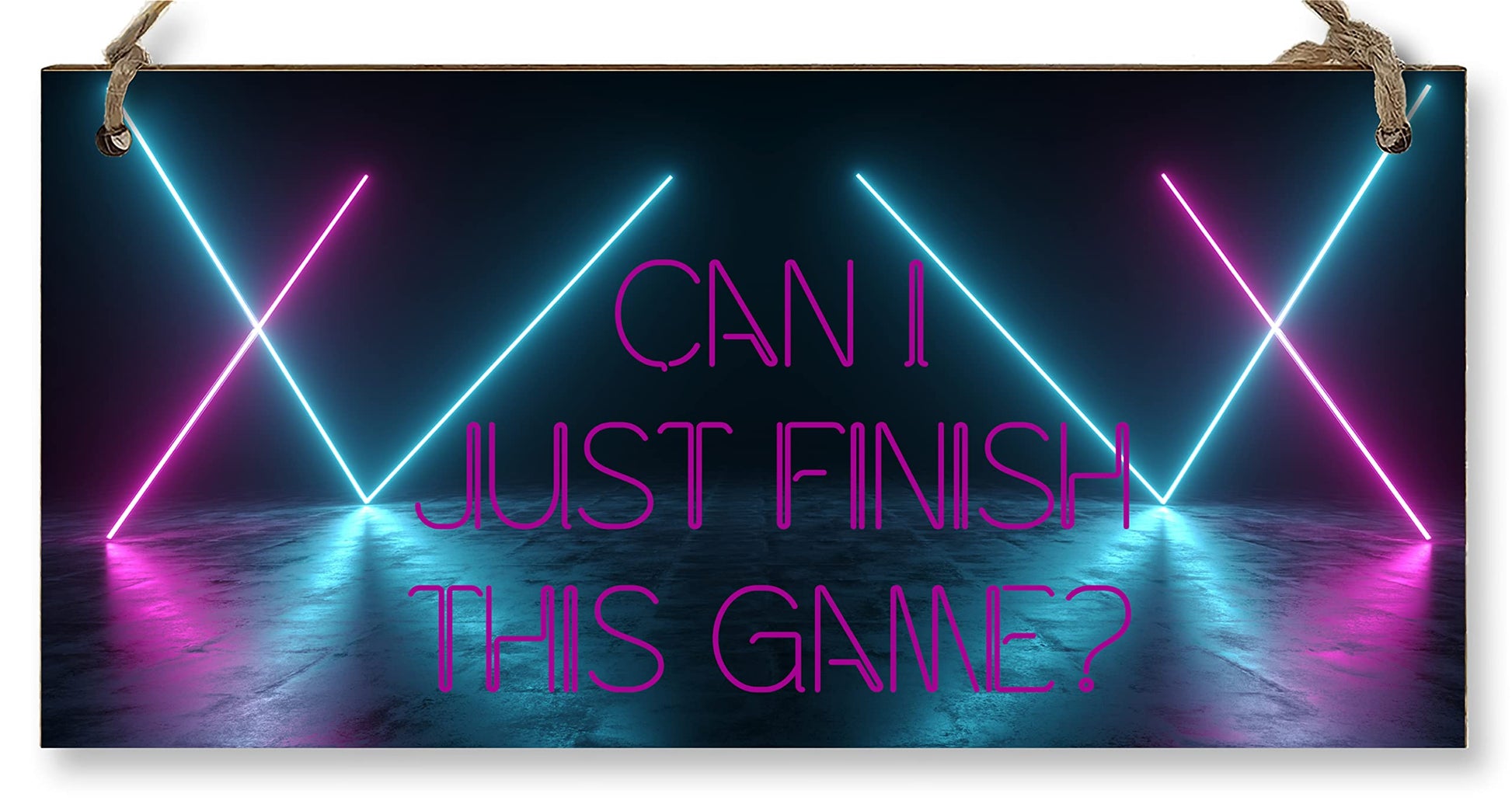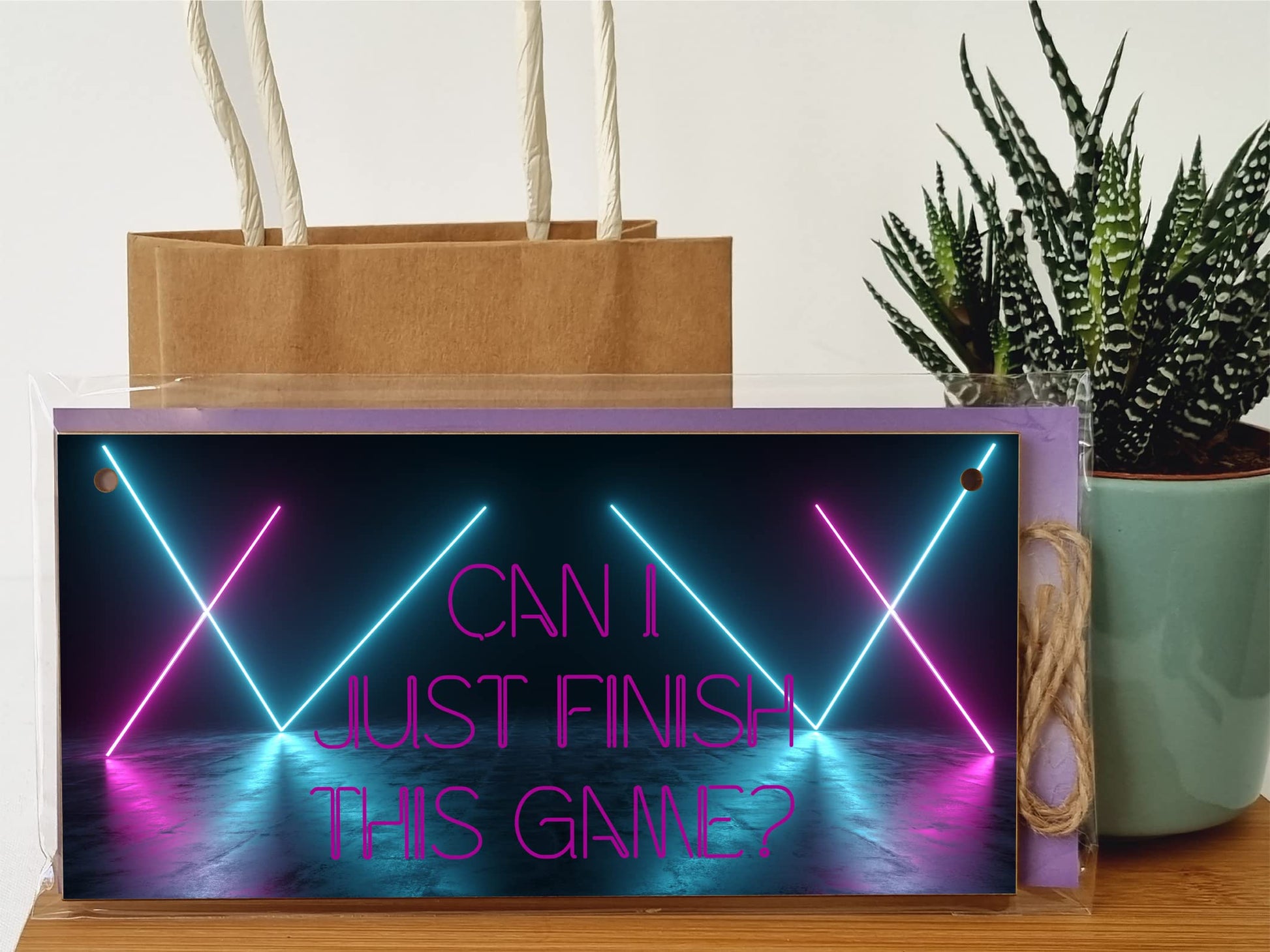 A decorative rectangular wooden hanging wall plaque, which is a stylish and unique way to decorate your home, or to give as a gift to someone special. Wording on the plaque: Can I just finish this game? The perfect door hanger or bedroom sign for gaming loving teenage boys, or hung in a man cave. This is a novelty and fun plaque with a whimsical take on the world of computer games. The plaque is made from high quality, sustainably sourced 5mm Plywood (PEFC Certified). The image is UV-printed in full colour, directly onto the wooden plaque, to ensure a high quality, bold and durable finish. It is packaged in a transparent sleeve, making it ideal to give as a gift, and comes with a small length of shabby, rustic hessian twine to hang up. This creative piece of wall art will add that little something extra to your space. From the kitchen to the living room, in the bathroom or the study, showcase your personality and hobbies in a fun and whimsical display. If not as a treat for you, then these are perfect to give as a gift to friends, family, neighbours, and colleagues. ***Please note, because these are made from untreated wood, the sign is designed for indoor use and should only be displayed outside for short periods during dry weather. Prolonged exposure to outdoor elements such as rain, water, frost, heat and UVs will damage and fade your sign.***