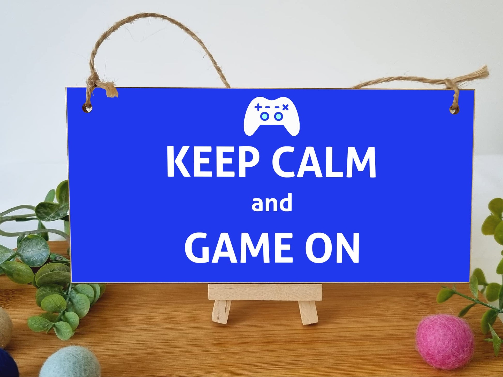 A decorative rectangular wooden hanging wall plaque, which is a stylish and unique way to decorate your home, or to give as a gift to someone special. Wording on the plaque: keep Calm and Game On. The perfect door hanger for gaming loving teenage boys, or hung in a man cave. This is a novelty and fun plaque with a whimsical take on the world of computer games. The plaque is made from high quality, sustainably sourced 5mm Plywood (PEFC Certified). The image is UV-printed in full colour, directly onto the wooden plaque, to ensure a high quality, bold and durable finish. It is packaged in a transparent sleeve, making it ideal to give as a gift, and comes with a small length of shabby, rustic hessian twine to hang up. This creative piece of wall art will add that little something extra to your space. From the kitchen to the living room, in the bathroom or the study, showcase your personality and hobbies in a fun and whimsical display. If not as a treat for you, then these are perfect to give as a gift to friends, family, neighbours, and colleagues. ***Please note, because these are made from untreated wood, the sign is designed for indoor use and should only be displayed outside for short periods during dry weather. Prolonged exposure to outdoor elements such as rain, water, frost, heat and UVs will damage and fade your sign.***