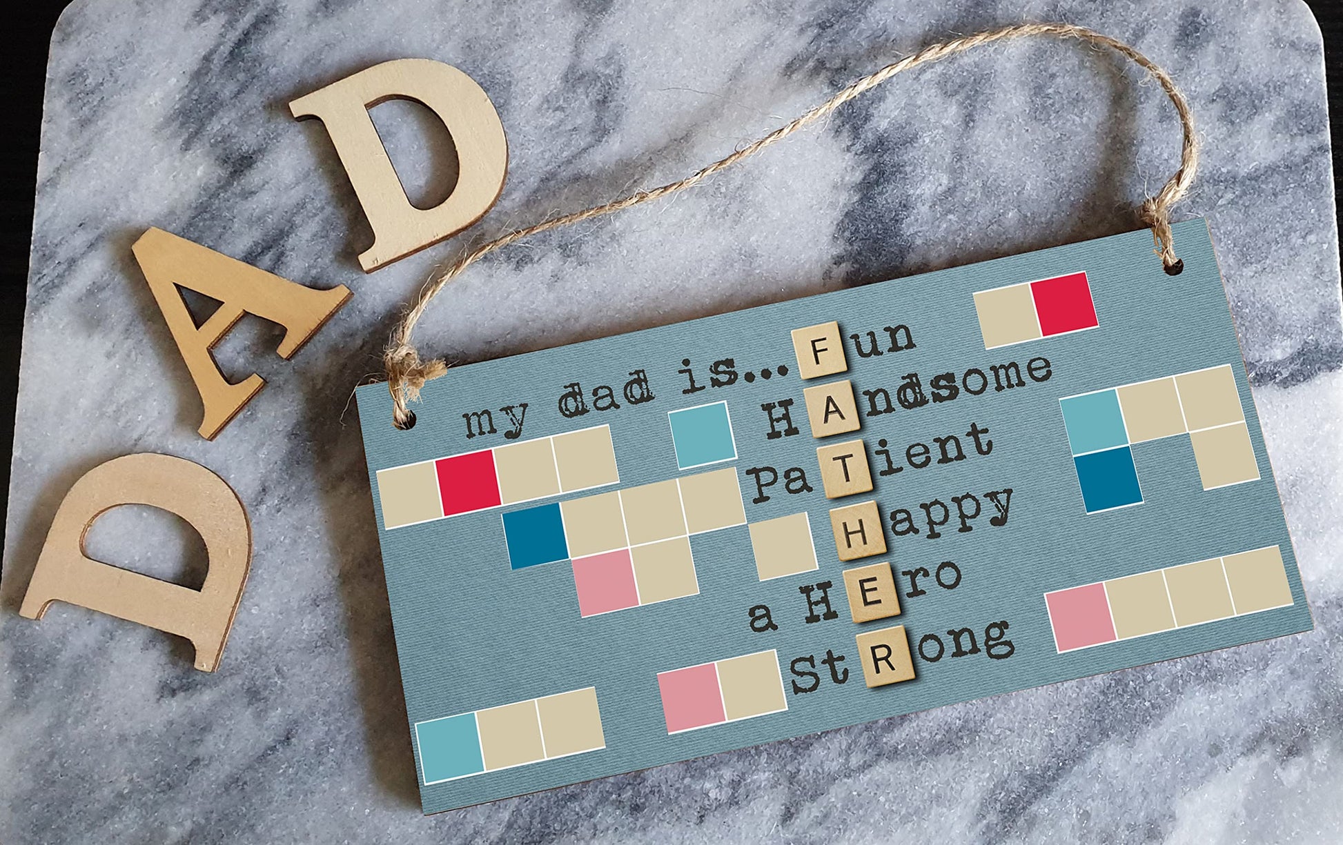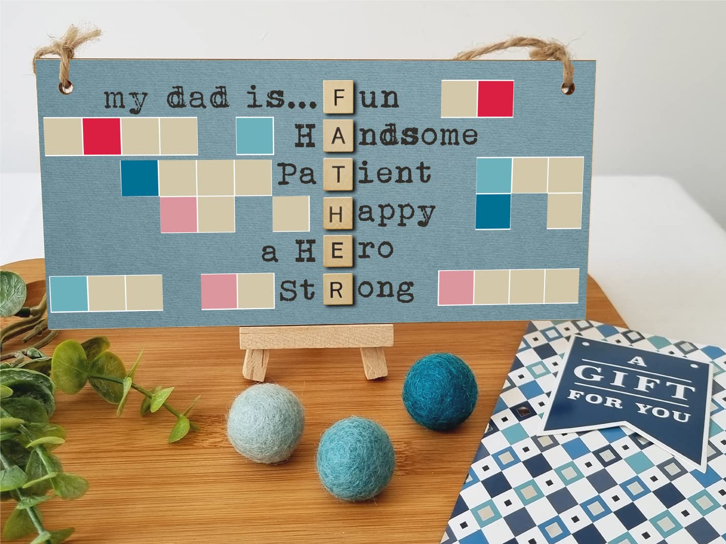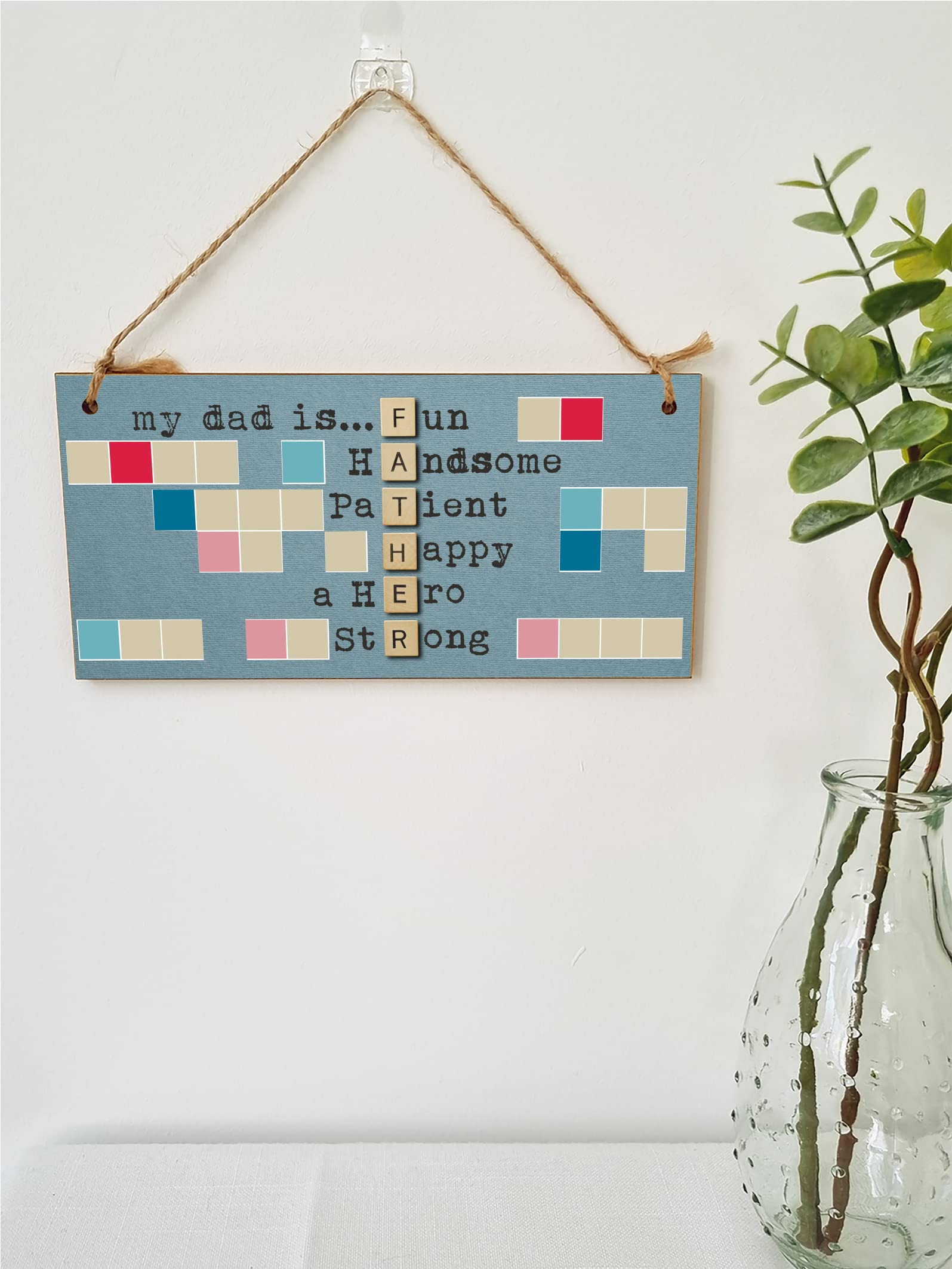 A decorative rectangular wooden hanging wall plaque, which is a stylish and unique way to decorate your home, or to give as a gift to someone special. Wording on the plaque: my dad is… Fun Handsome Patient Happy a Hero Strong A beautiful, heartfelt plaque with a quote about the importance of family. Perfect as a gift for your dad, brother, uncle or grandad. Can be hung anywhere in the house to remind them of the bond you have, and how much they mean to you. The plaque is made from high quality, sustainably sourced 5mm Plywood (PEFC Certified). The image is UV-printed in full colour, directly onto the wooden plaque, to ensure a high quality, bold and durable finish. It is packaged in a transparent sleeve, making it ideal to give as a gift, and comes with a small length of shabby, rustic hessian twine to hang up. This creative piece of wall art will add that little something extra to your space. From the kitchen to the living room, in the bathroom or the study, showcase your personality and hobbies in a fun and whimsical display. If not as a treat for you, then these are perfect to give as a gift to friends, family, neighbours, and colleagues. ***Please note, because these are made from untreated wood, the sign is designed for indoor use and should only be displayed outside for short periods during dry weather. Prolonged exposure to outdoor elements such as rain, water, frost, heat and UVs will damage and fade your sign.***