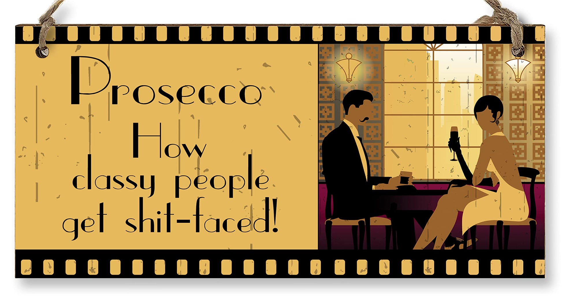 A decorative rectangular wooden hanging wall plaque, which is a stylish and unique way to decorate your home, or to give as a gift to someone special. Wording on the plaque: Prosecco How classy people get shit-faced A great decorative plaque to hang in the kitchen, home bar, the man cave or to give as a gift to your booze loving mates. The plaque is made from high quality, sustainably sourced 5mm Plywood (PEFC Certified). The image is UV-printed in full colour, directly onto the wooden plaque, to ensure a high quality, bold and durable finish. It is packaged in a transparent sleeve, making it ideal to give as a gift, and comes with a small length of shabby, rustic hessian twine to hang up. This creative piece of wall art will add that little something extra to your space. From the kitchen to the living room, in the bathroom or the study, showcase your personality and hobbies in a fun and whimsical display. If not as a treat for you, then these are perfect to give as a gift to friends, family, neighbours, and colleagues. ***Please note, because these are made from untreated wood, the sign is designed for indoor use and should only be displayed outside for short periods during dry weather. Prolonged exposure to outdoor elements such as rain, water, frost, heat and UVs will damage and fade your sign.***