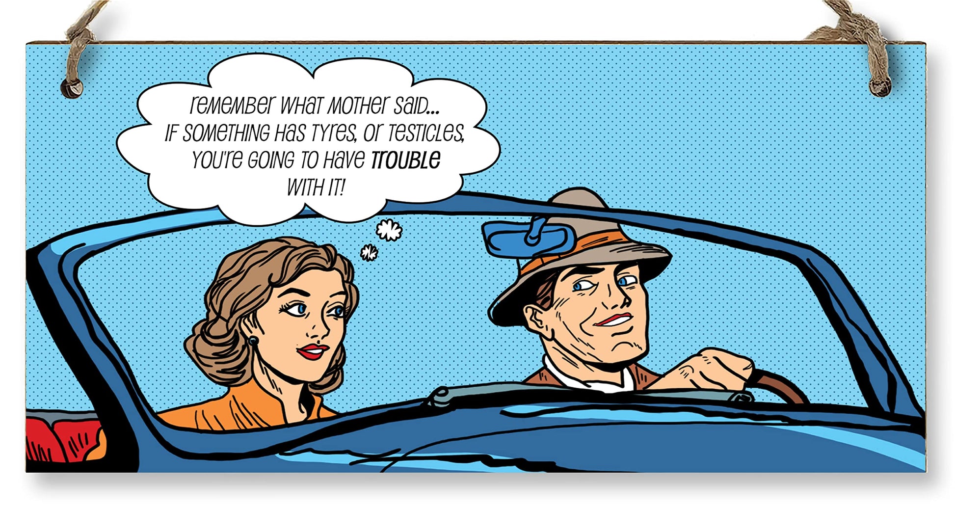 A decorative rectangular wooden hanging wall plaque, which is a stylish and unique way to decorate your home, or to give as a gift to someone special. Wording on the plaque: Remember what mother said… if something has tyres or testicles, you're going to have trouble with it! Give the gift of laughter with this funny, novelty sign. A bit risque and tongue in cheek, these are an ideal gift for a friend or as a treat for yourself. The plaque is made from high quality, sustainably sourced 5mm Plywood (PEFC Certified). The image is UV-printed in full colour, directly onto the wooden plaque, to ensure a high quality, bold and durable finish. It is packaged in a transparent sleeve, making it ideal to give as a gift, and comes with a small length of shabby, rustic hessian twine to hang up. This creative piece of wall art will add that little something extra to your space. From the kitchen to the living room, in the bathroom or the study, showcase your personality and hobbies in a fun and whimsical display. If not as a treat for you, then these are perfect to give as a gift to friends, family, neighbours, and colleagues. ***Please note, because these are made from untreated wood, the sign is designed for indoor use and should only be displayed outside for short periods during dry weather. Prolonged exposure to outdoor elements such as rain, water, frost, heat and UVs will damage and fade your sign.***