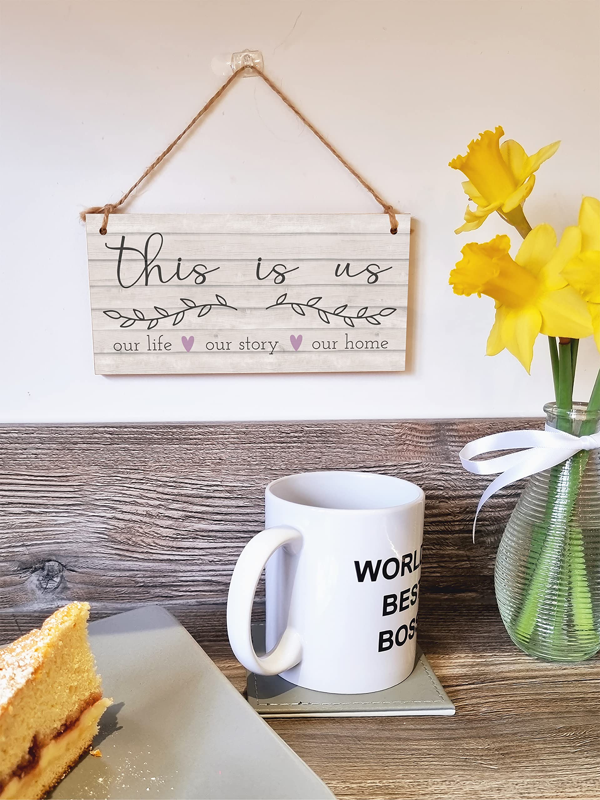 A decorative rectangular wooden hanging wall plaque, which is a stylish and unique way to decorate your home, or to give as a gift to someone special. Wording on the plaque: this is us our life, our story our home This plaque is a beautiful reminder of the love in your home, and would be perfect in any room of the house to celebrate your family. The plaque is made from high quality, sustainably sourced 5mm Plywood (PEFC Certified). The image is UV-printed in full colour, directly onto the wooden plaque, to ensure a high quality, bold and durable finish. It is packaged in a transparent sleeve, making it ideal to give as a gift, and comes with a small length of shabby, rustic hessian twine to hang up. This creative piece of wall art will add that little something extra to your space. From the kitchen to the living room, in the bathroom or the study, showcase your personality and hobbies in a fun and whimsical display. If not as a treat for you, then these are perfect to give as a gift to friends, family, neighbours, and colleagues. ***Please note, because these are made from untreated wood, the sign is designed for indoor use and should only be displayed outside for short periods during dry weather. Prolonged exposure to outdoor elements such as rain, water, frost, heat and UVs will damage and fade your sign.***