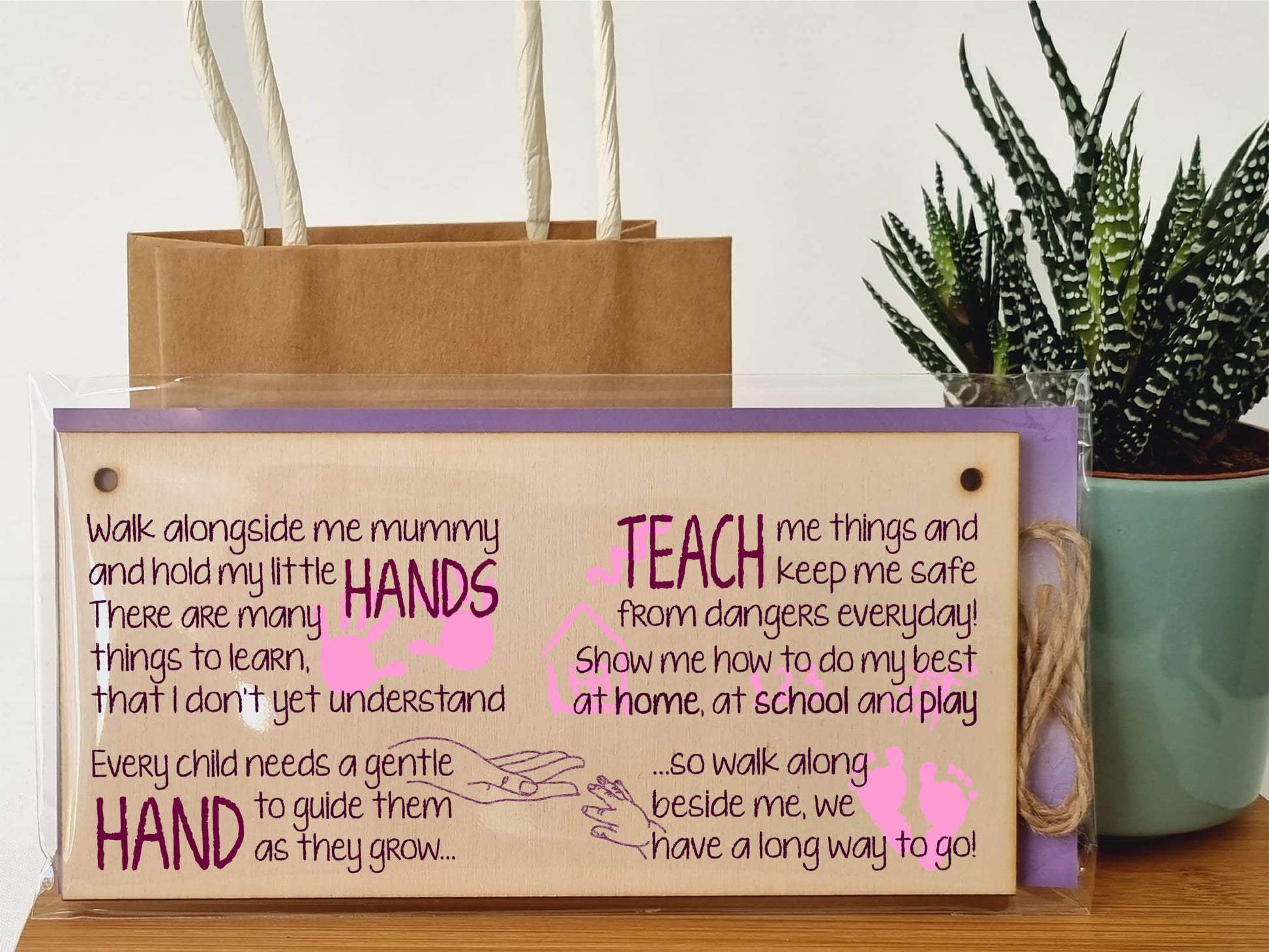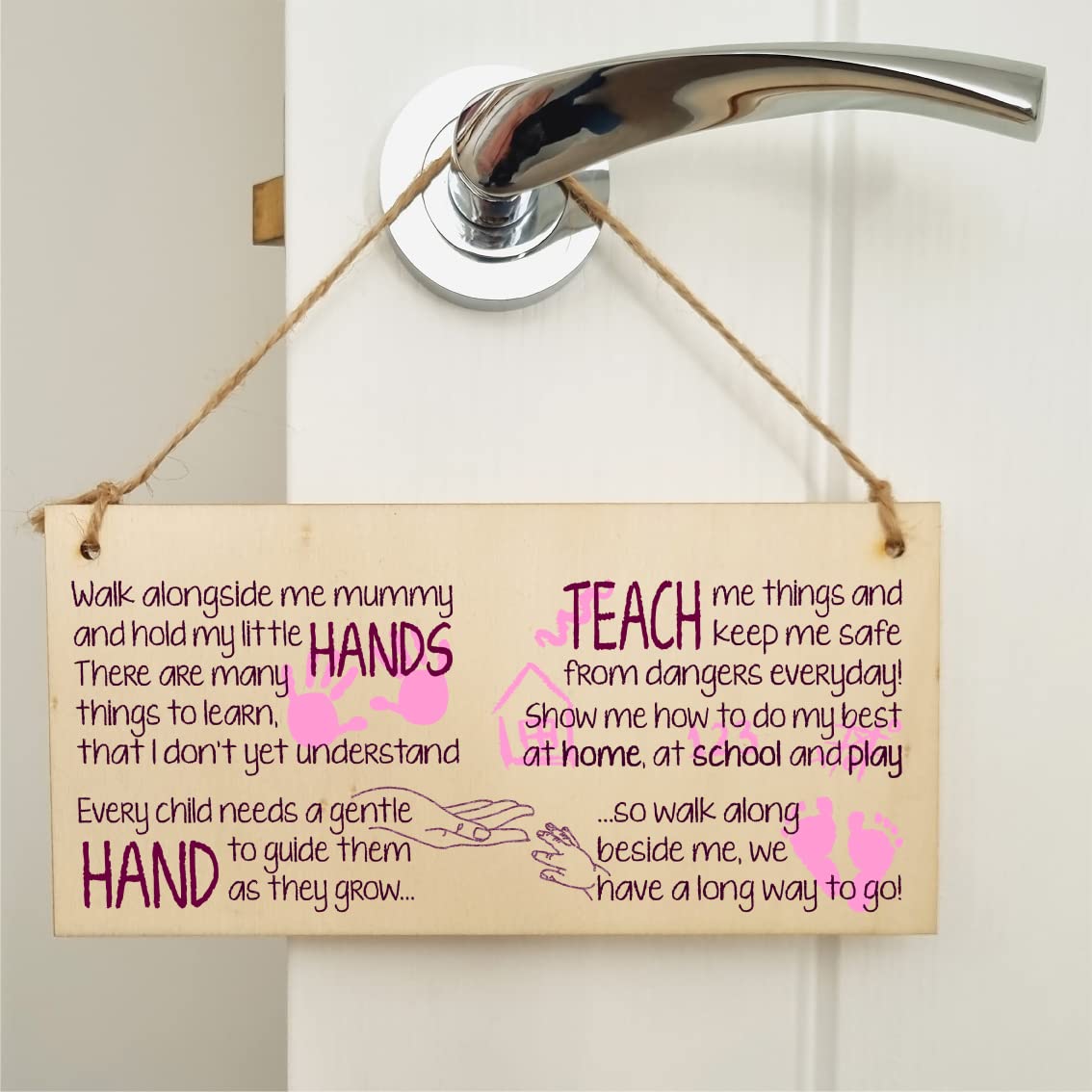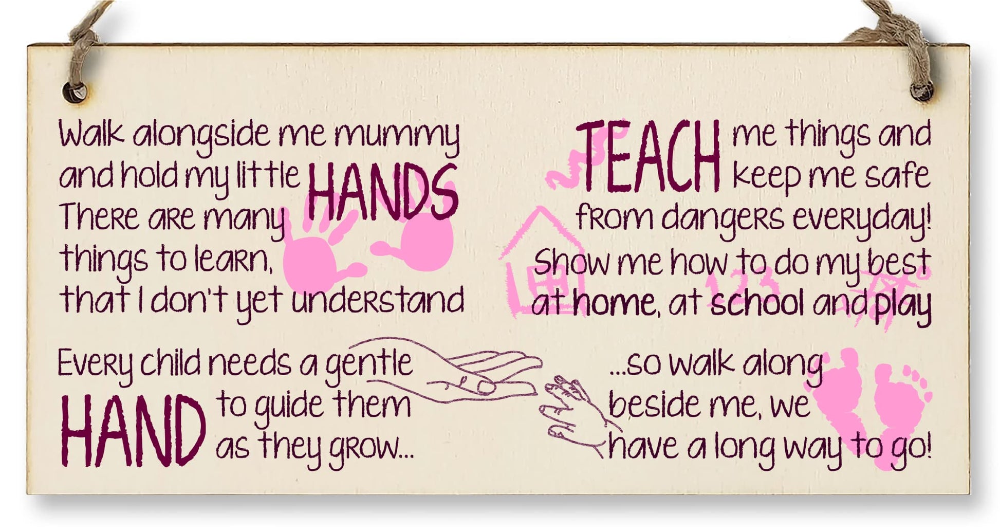 A decorative rectangular wooden hanging wall plaque, which is a stylish and unique way to decorate your home, or to give as a gift to someone special. Wording on the plaque: Walk alongside me mummy and hold my little hands. There are many things to learn, that I don't yet understand. Teach me things and keep me safe from dangers everyday! Show me how to do my best as home, at school and play. Every child needs a gentle hand to guide them as they grow ... so walk along beside me, we have a long way to go A beautiful, heartfelt and inspirational plaque that would be perfect for the best Mum in the world. Great as a gift this Mother's Day for mummys, grandmas, aunties and friends. Ideal decoration for the home - hang in the kitchen, the living room or the bedroom.The plaque is made from high quality, sustainably sourced 5mm Plywood (PEFC Certified). The image is UV-printed in full colour, directly onto the wooden plaque, to ensure a high quality, bold and durable finish. It is packaged in a transparent sleeve, making it ideal to give as a gift, and comes with a small length of shabby, rustic hessian twine to hang up. This creative piece of wall art will add that little something extra to your space. From the kitchen to the living room, in the bathroom or the study, showcase your personality and hobbies in a fun and whimsical display. If not as a treat for you, then these are perfect to give as a gift to friends, family, neighbours, and colleagues. ***Please note, because these are made from untreated wood, the sign is designed for indoor use and should only be displayed outside for short periods during dry weather. Prolonged exposure to outdoor elements such as rain, water, frost, heat and UVs will damage and fade your sign.***