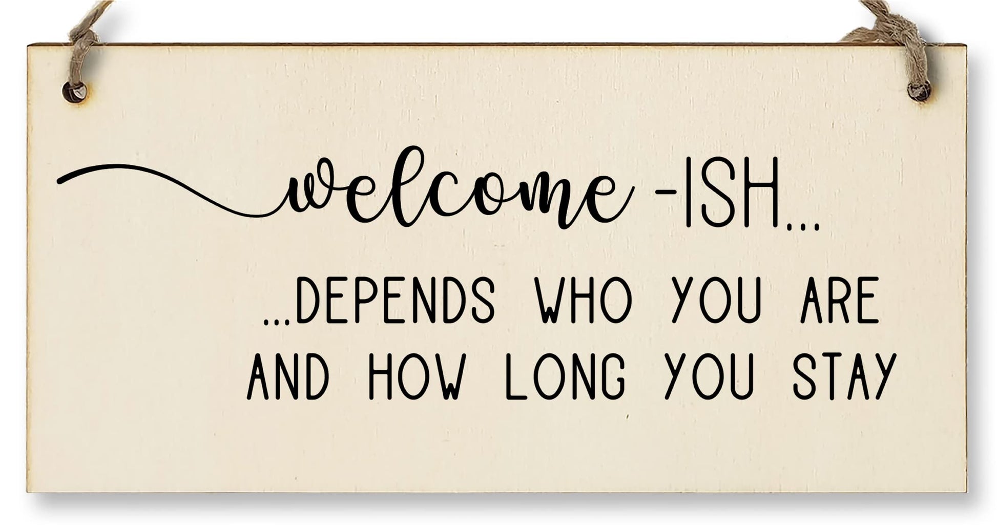 A decorative rectangular wooden hanging wall plaque, which is a stylish and unique way to decorate your home, or to give as a gift to someone special. Wording on the plaque: welcome-ish depends who you are and how long you stay This plaque is a novelty and funny way to spread some humour in your home, and would be perfect in any room of the house. Give someone a laugh when they come to visit by hanging it by the front door.The plaque is made from high quality, sustainably sourced 5mm Plywood (PEFC Certified). The image is UV-printed in full colour, directly onto the wooden plaque, to ensure a high quality, bold and durable finish. It is packaged in a transparent sleeve, making it ideal to give as a gift, and comes with a small length of shabby, rustic hessian twine to hang up. This creative piece of wall art will add that little something extra to your space. From the kitchen to the living room, in the bathroom or the study, showcase your personality and hobbies in a fun and whimsical display. If not as a treat for you, then these are perfect to give as a gift to friends, family, neighbours, and colleagues. ***Please note, because these are made from untreated wood, the sign is designed for indoor use and should only be displayed outside for short periods during dry weather. Prolonged exposure to outdoor elements such as rain, water, frost, heat and UVs will damage and fade your sign.***