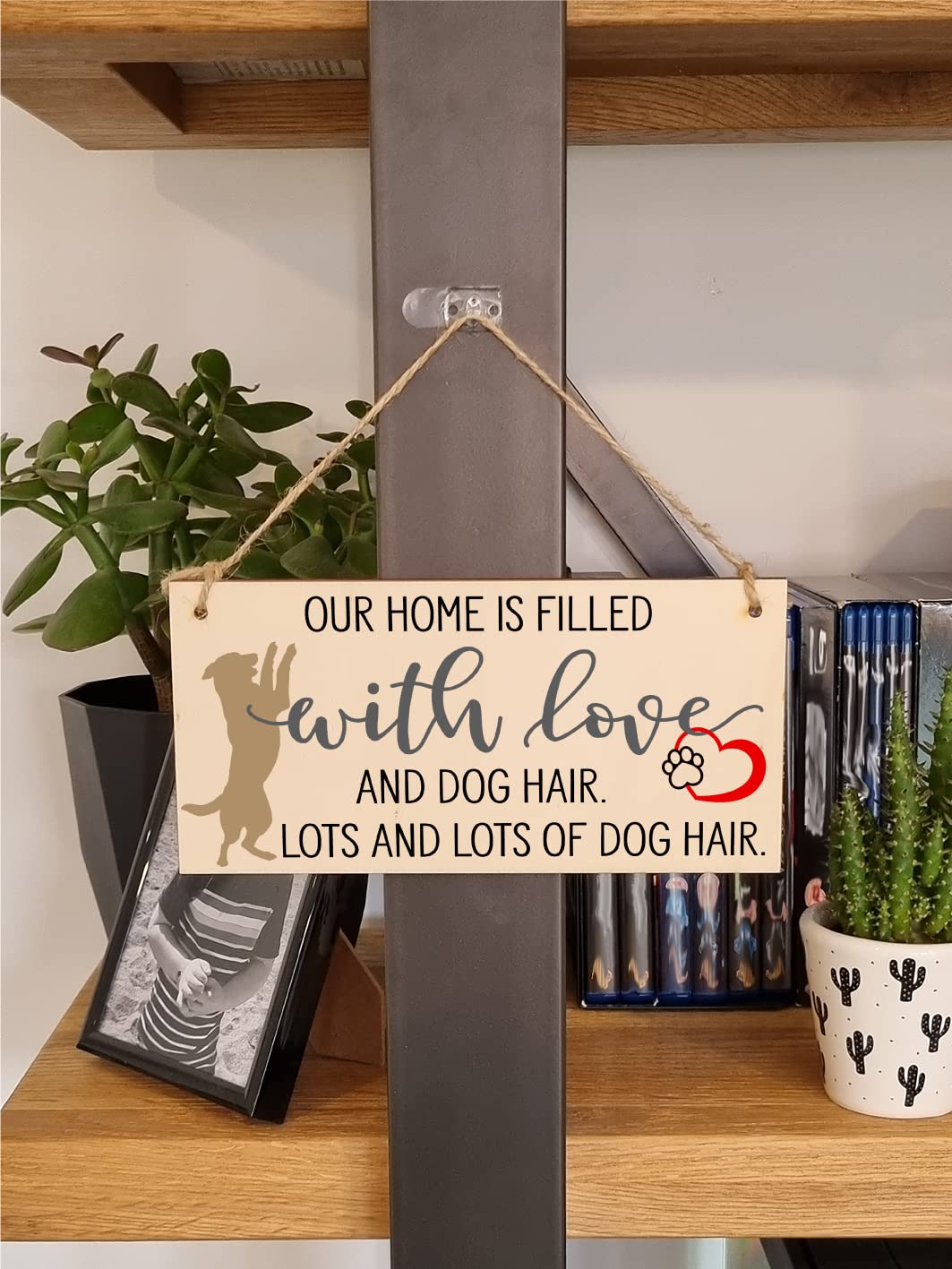 A decorative rectangular wooden hanging wall plaque, which is a stylish and unique way to decorate your home, or to give as a gift to someone special. Wording on the plaque: Our home is filled with love and dog hair. Lots and lots of dog hair.. Give your pet some love with this funny, heartfelt/novelty sign. Ideal to hang above their bed or food bowls and show how much your pet means to you. This could be perfect as a gift for fur baby loving friends and family. The plaque is made from high quality, sustainably sourced 6mm Plywood (PEFC Certified). The image is UV-printed in full colour, directly onto the wooden plaque, to ensure a high quality, bold and durable finish. It is packaged in a transparent sleeve, making it ideal to give as a gift, and comes with a small length of shabby, rustic hessian twine to hang up. This creative piece of wall art will add that little something extra to your space. From the kitchen to the living room, in the bathroom or the study, showcase your personality and hobbies in a fun and whimsical display. If not as a treat for you, then these are perfect to give as a gift to friends, family, neighbour's, and colleagues. ***Please note, because these are made from untreated wood, the sign is designed for indoor use and should only be displayed outside for short periods during dry weather. Prolonged exposure to outdoor elements such as rain, water, frost, heat and UVs will damage and fade your sign.***