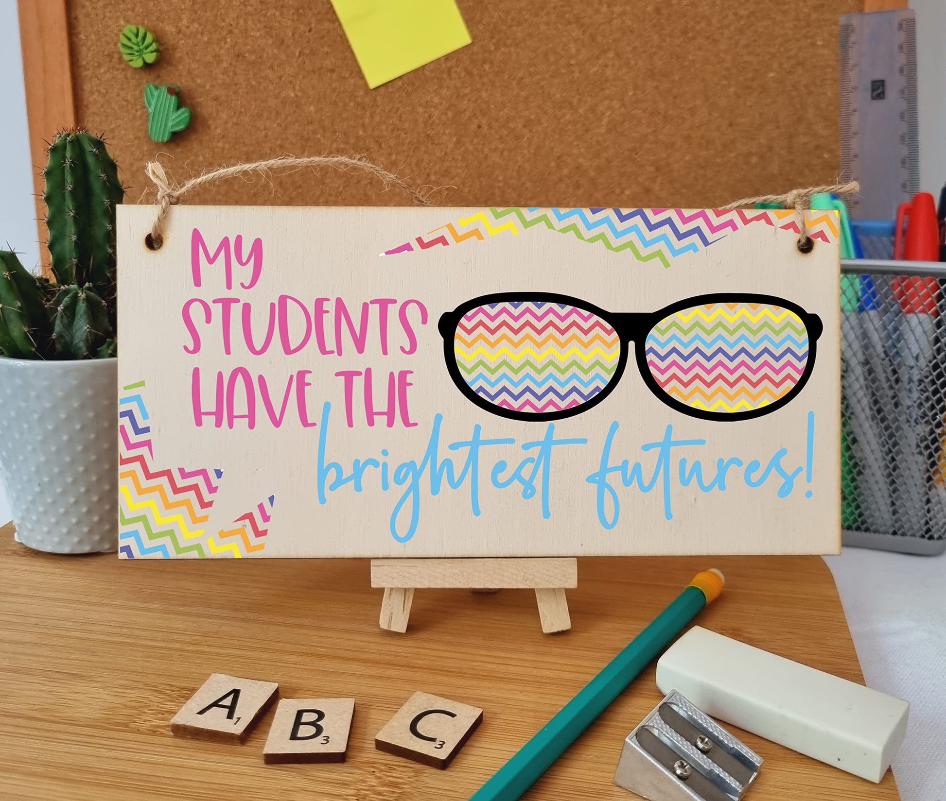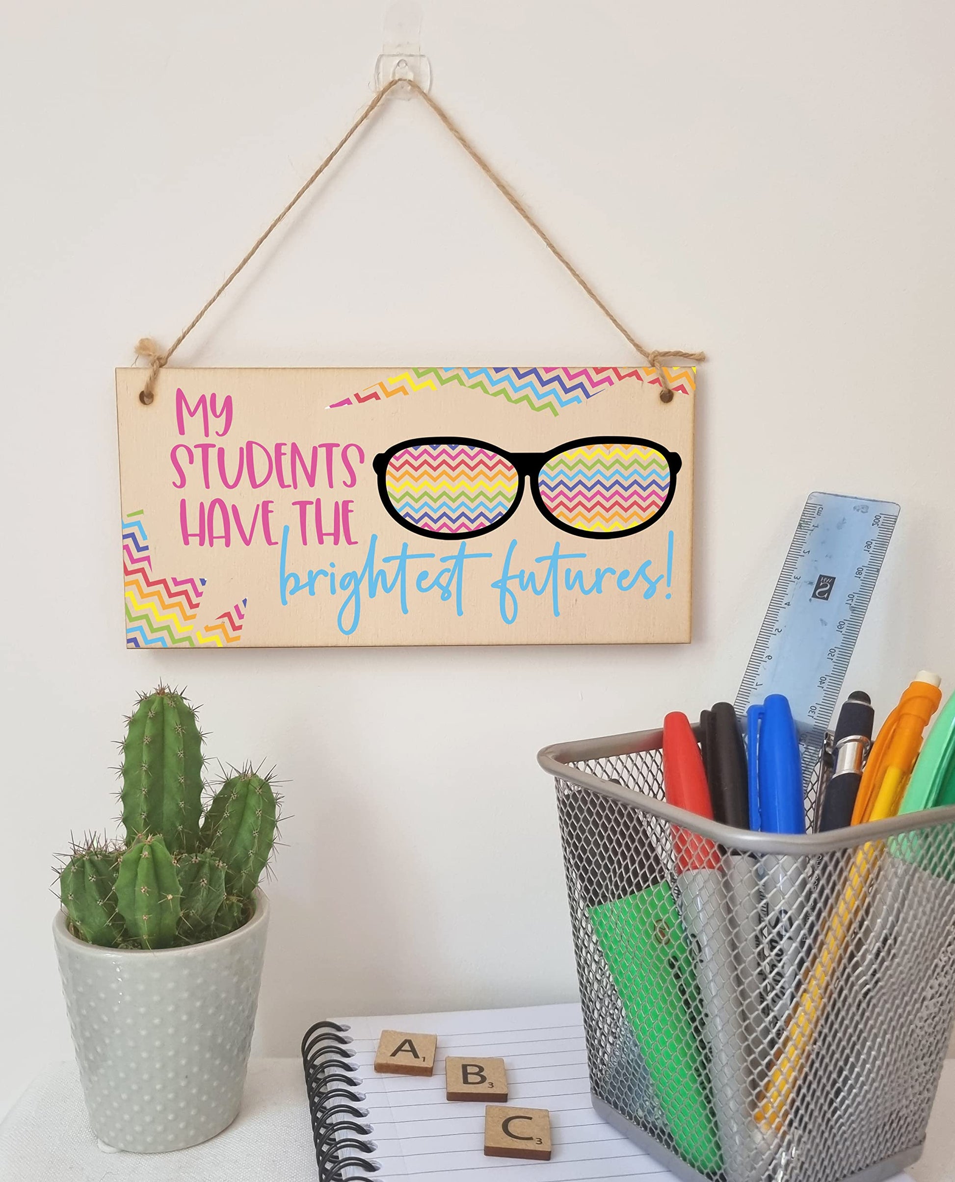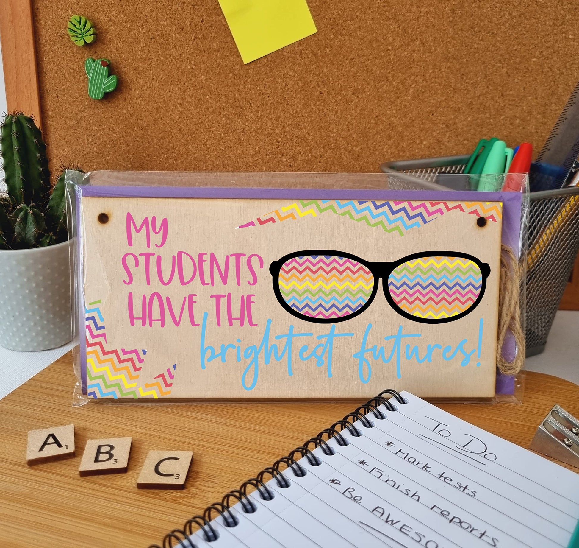 A decorative rectangular wooden hanging wall plaque, which is a stylish and unique way to decorate your home, or to give as a gift to someone special. Wording on the plaque: My students have the brightest futures!. Give your favourite teacher a fun decorative sign to hang above their desk. A perfect gift at the end of the school terms to show the best teacher or teaching assistant how important and amazing they are. The plaque is made from high quality, sustainably sourced 5mm Plywood (PEFC Certified). The image is UV-printed in full colour, directly onto the wooden plaque, to ensure a high quality, bold and durable finish. It is packaged in a transparent sleeve, making it ideal to give as a gift, and comes with a small length of shabby, rustic hessian twine to hang up. This creative piece of wall art will add that little something extra to your space. From the kitchen to the living room, in the bathroom or the study, showcase your personality and hobbies in a fun and whimsical display. If not as a treat for you, then these are perfect to give as a gift to friends, family, neighbours, and colleagues. ***Please note, because these are made from untreated wood, the sign is designed for indoor use and should only be displayed outside for short periods during dry weather. Prolonged exposure to outdoor elements such as rain, water, frost, heat and UVs will damage and fade your sign.***