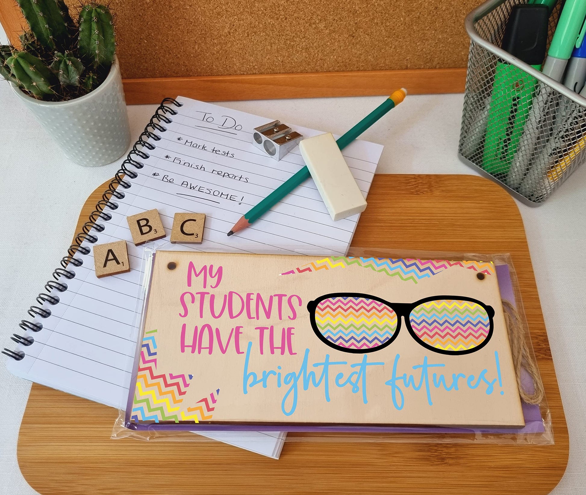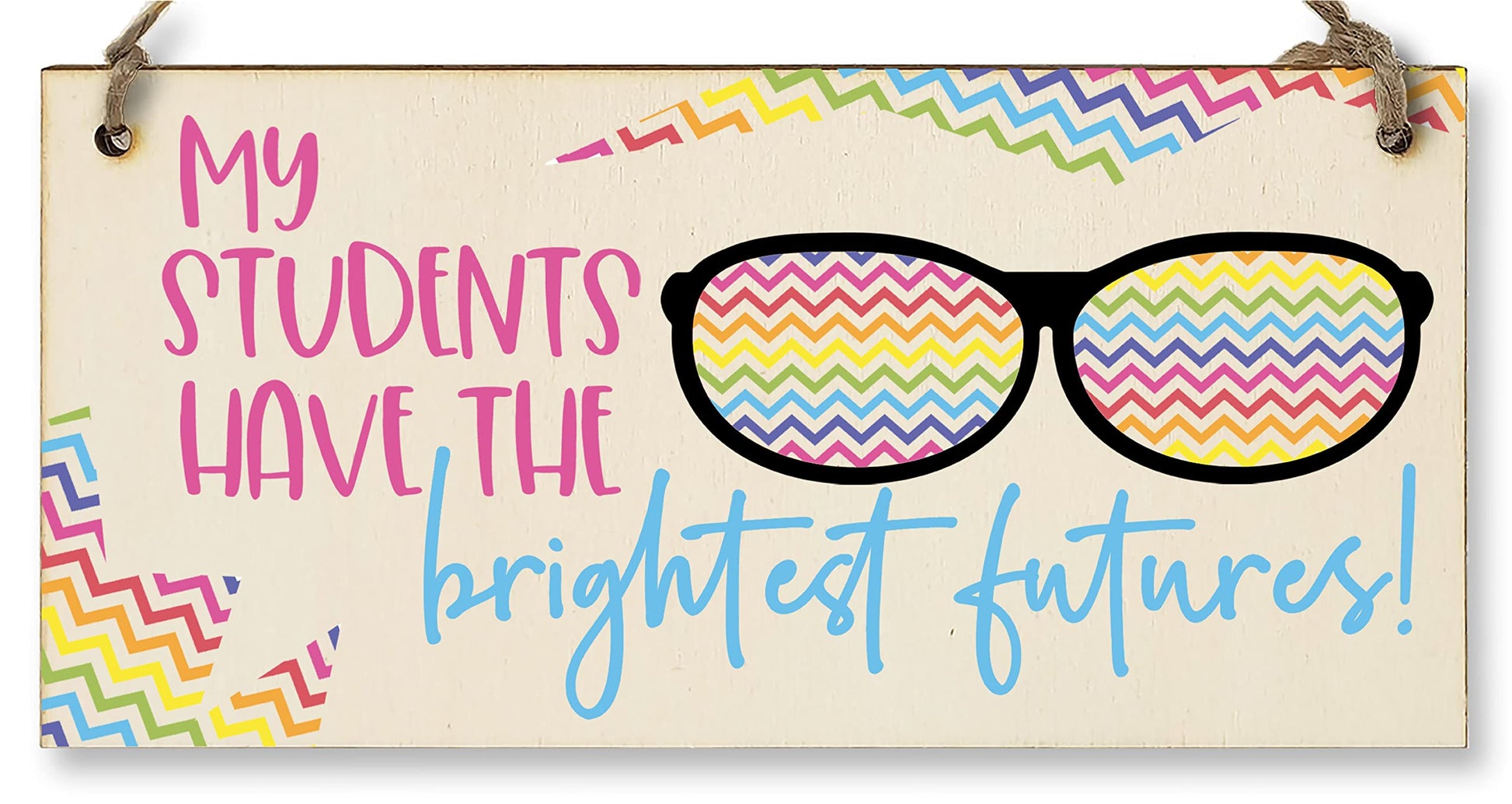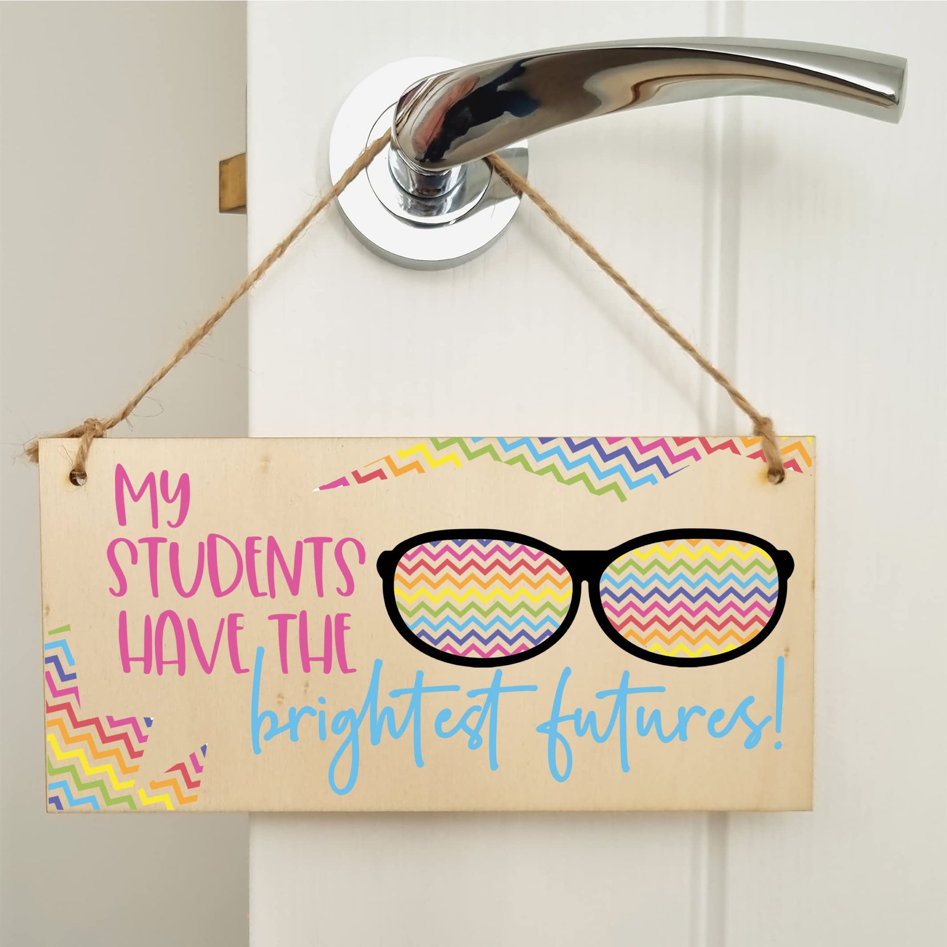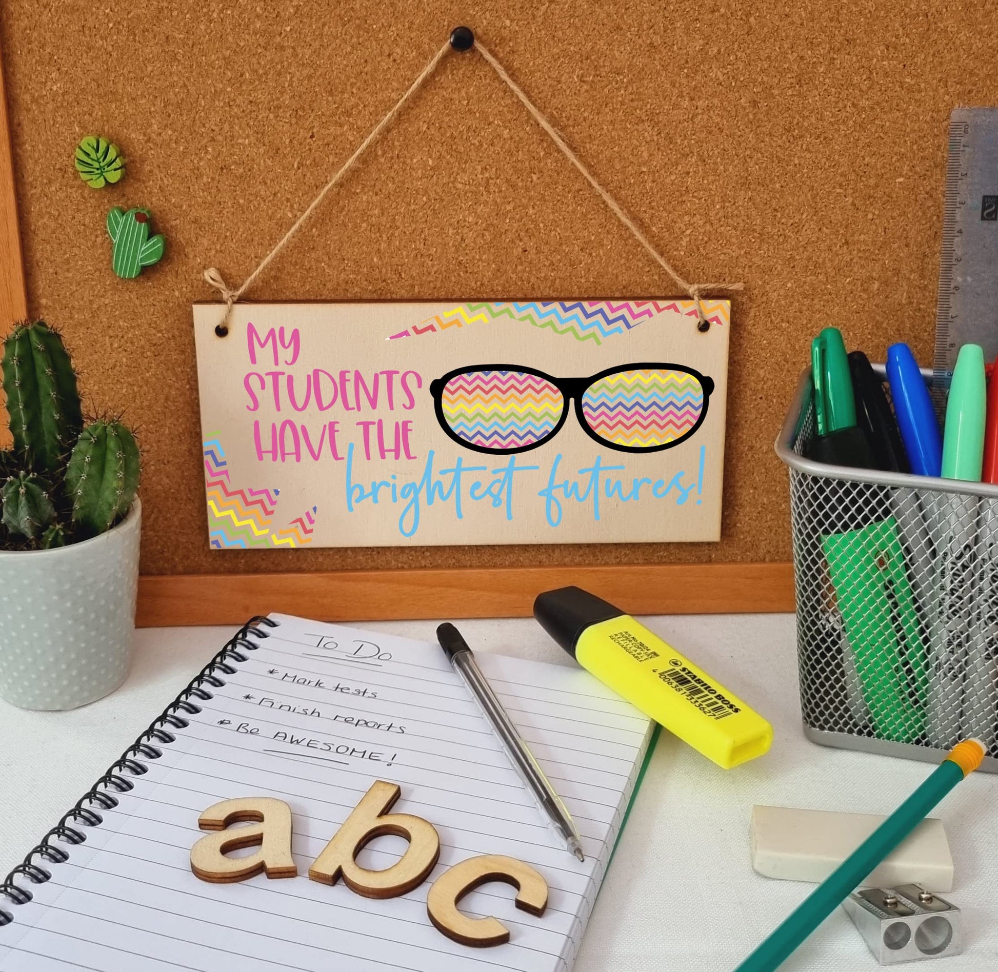 A decorative rectangular wooden hanging wall plaque, which is a stylish and unique way to decorate your home, or to give as a gift to someone special. Wording on the plaque: My students have the brightest futures!. Give your favourite teacher a fun decorative sign to hang above their desk. A perfect gift at the end of the school terms to show the best teacher or teaching assistant how important and amazing they are. The plaque is made from high quality, sustainably sourced 5mm Plywood (PEFC Certified). The image is UV-printed in full colour, directly onto the wooden plaque, to ensure a high quality, bold and durable finish. It is packaged in a transparent sleeve, making it ideal to give as a gift, and comes with a small length of shabby, rustic hessian twine to hang up. This creative piece of wall art will add that little something extra to your space. From the kitchen to the living room, in the bathroom or the study, showcase your personality and hobbies in a fun and whimsical display. If not as a treat for you, then these are perfect to give as a gift to friends, family, neighbours, and colleagues. ***Please note, because these are made from untreated wood, the sign is designed for indoor use and should only be displayed outside for short periods during dry weather. Prolonged exposure to outdoor elements such as rain, water, frost, heat and UVs will damage and fade your sign.***