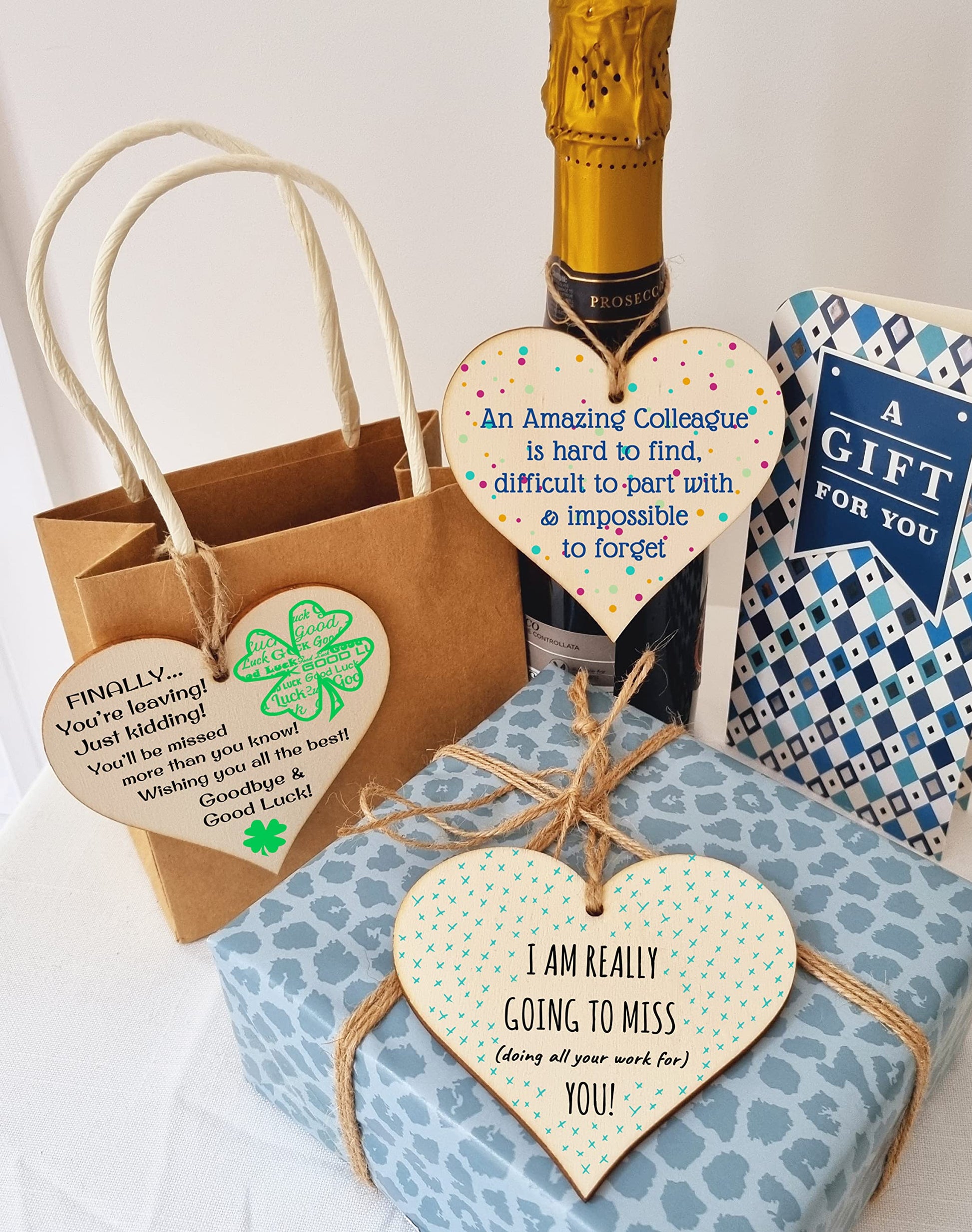 A multipack of x3 hanging wooden heart plaque decorations. This pack contains a set of 3 leaving themed hearts, perfect for many occasions. Each heart is made from FSC certified 3mm thick plywood, with a hand illustrated design printed directly onto the wood. Each heart measures approx. 10 x10cm, making it the perfect size to give as a small token gift. Ideal as a card alternative, it can be posted directly to the recipient, or these are also perfect around the neck of a bottle or as a gift tag on a present. With a carefully chosen selection of x3 complementary designs, you will have a gift at hand just when you need it. Contents: Plaque 1 - An Amazing Colleague is hard to find, difficult to part with & impossible to forget Plaque 2 - Finally… You're Leaving!! Just kidding! You'll be missed more than you know. Wishing you all the best. Goodbye & Good Luck. Plaque 3 - I am really gonna miss (doing all your work for) YOU.
