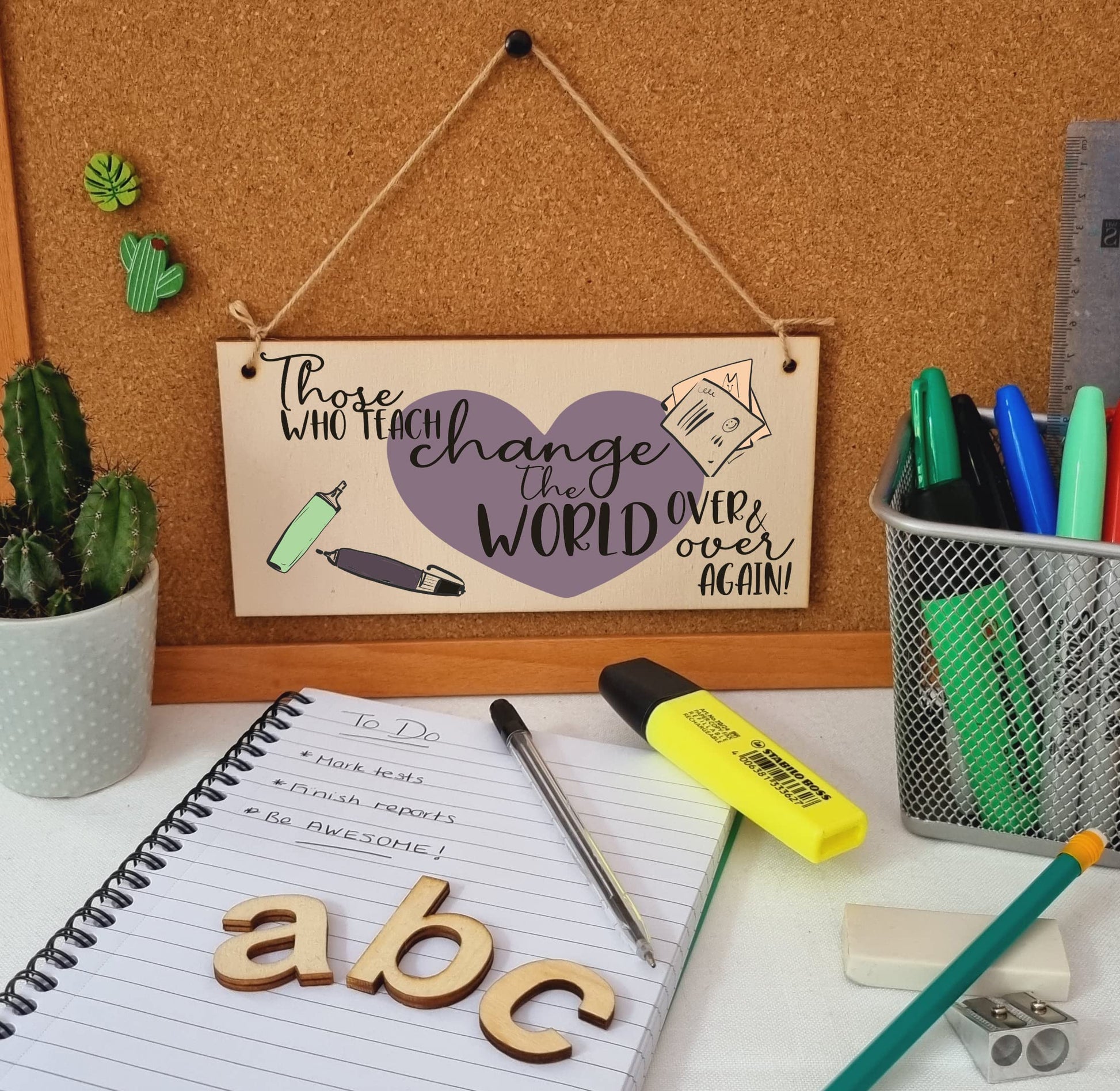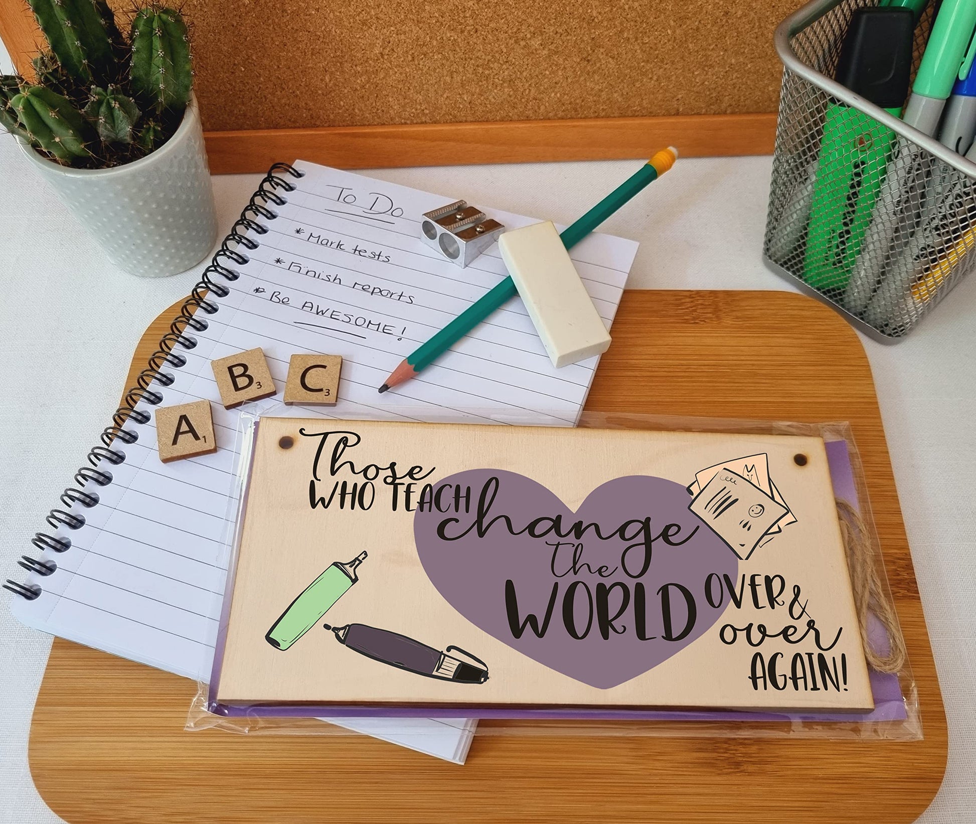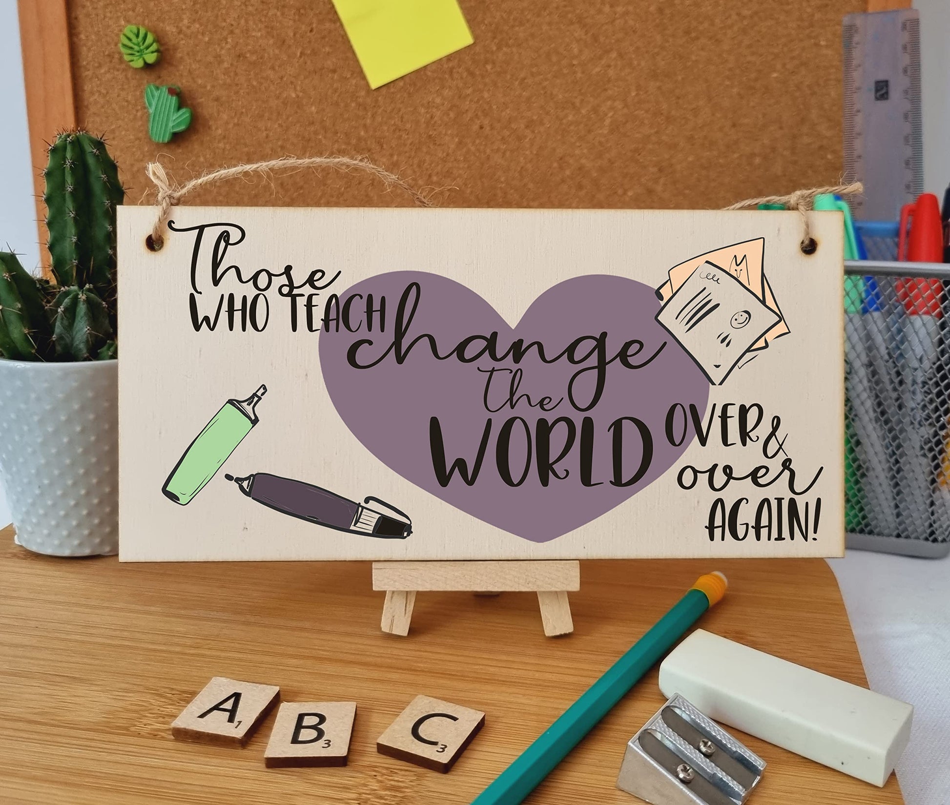 A decorative rectangular wooden hanging wall plaque, which is a stylish and unique way to decorate your home, or to give as a gift to someone special. Wording on the plaque: Those who teach change the world over and over again. Give your favourite teacher a fun decorative sign to hang above their desk. A perfect gift at the end of the school terms to show the best teacher or teaching assistant how important and amazing they are. The plaque is made from high quality, sustainably sourced 5mm Plywood (PEFC Certified). The image is UV-printed in full colour, directly onto the wooden plaque, to ensure a high quality, bold and durable finish. It is packaged in a transparent sleeve, making it ideal to give as a gift, and comes with a small length of shabby, rustic hessian twine to hang up. This creative piece of wall art will add that little something extra to your space. From the kitchen to the living room, in the bathroom or the study, showcase your personality and hobbies in a fun and whimsical display. If not as a treat for you, then these are perfect to give as a gift to friends, family, neighbours, and colleagues. ***Please note, because these are made from untreated wood, the sign is designed for indoor use and should only be displayed outside for short periods during dry weather. Prolonged exposure to outdoor elements such as rain, water, frost, heat and UVs will damage and fade your sign.***